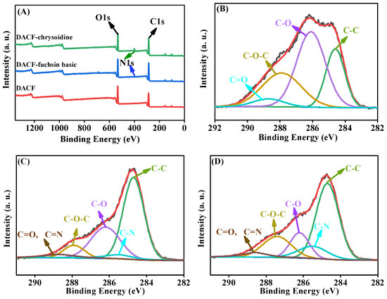 It is clear that the peaks located at 285, 400, and 532 eV correspond to C1s, N1s, and O1s, respectively [48,49,50], as shown in Figure 11A. In the spectra of the DACF membrane after adsorption, N1s orbital transition peaks at 400 eV were observed, instead of the original spectrum of the DACF membrane, which confirmed that the N1s came from chrysoidine and fuchsin basic and, therefore, that the adsorption was successful.