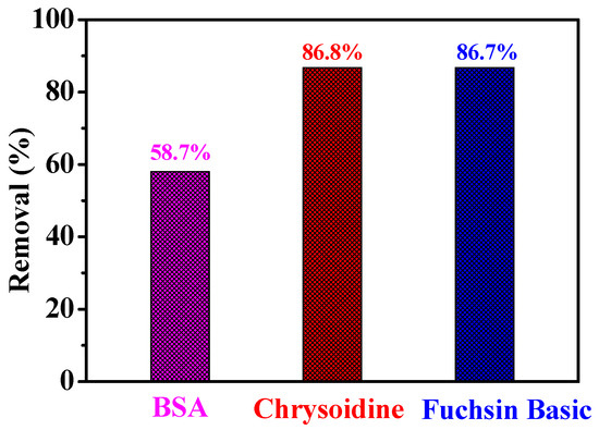 The adsorption capability of the DACF membrane against multicomponent DON wastewater was evaluated. The organic nitrogen contents of BSA, chrysoidine, and fuchsin basic were 70%, 15%, and 15%, respectively, and this composition was used to simulate the distribution of DON in wastewater. An adsorption of the DACF membrane against simulated wastewater containing BSA (5 mg/L), chrysoidine (0.66 mg/L), and fuchsin basic (1.2 mg/L), which showed that the DON content was 1.0 mg/L, was demonstrated. The adsorption process was carried out at room temperature for 24 h. The removal efficiency of the DACF membrane for the simulated DON wastewater is shown in Figure 12.