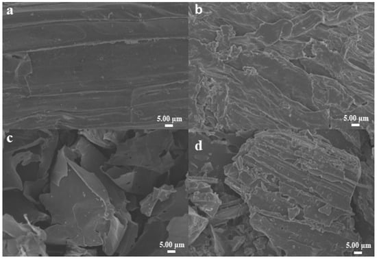 SEM diagram of CS (a), KCS (b), CSB (c), and KCSB (d) (CS: Corn straw; KCS: KOH-modified biomass; CSB: Corn straw biochar; KCSB: KOH-modified biochar).