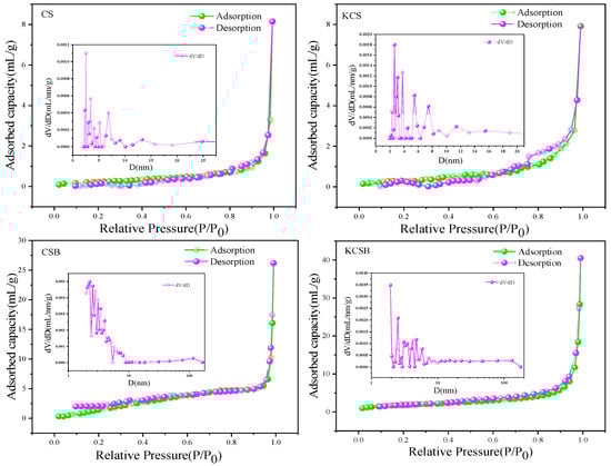 The N2 adsorption–desorption isotherm of the adsorbents and the pore size distribution of BJH are shown in Figure 2. The N2 adsorption–desorption isotherm of all four adsorbents confirms the characteristics of a type-III isotherm. The adsorption isotherm is concave across the entire pressure range, and the amount of adsorbed gas increases with the component pressure of the group. There is no inflection point. It is possible that the interaction between an adsorbent and molecules is stronger than that between an adsorbent and adsorbent [29]. Additionally, the pore size distribution diagram indicates that the four adsorbents mostly have mesoporous structures with pore sizes ranging from 2 to 10 nm [30]. The specific surface area and pore structure parameters obtained from the N2 adsorption–desorption curve are listed in Table 1, which confirmed that the specific surface area and pore volume of the modified CS both increased, indicating that KCS enhanced the adsorption capacity of TC and Cu(II) in water by increasing the specific surface area of CS. Following the modification, the average pore diameter and pore volume of CSB increased, and the pore structure of KCSB significantly improved, enabling it to adsorb TC and Cu(II) in water through the pore-filling mechanism [31].