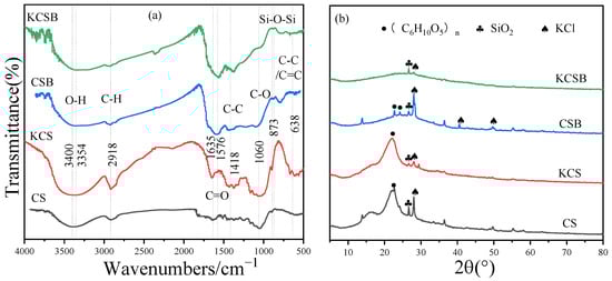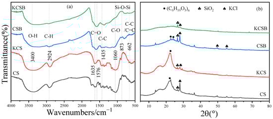 The functional groups of the adsorbent’s surface were determined using FTIR. As shown in Figure 3a, the O-H stretching vibration peak is represented by spectrum bands at 3300~3400 cm−1, while the vibration adsorption peak of C-H groups is represented by the characteristic peaks at 2918 and 2924 cm−1. The peaks at 1576 and 1635 cm−1 correspond to the C=O tensile vibration and aromatic ring, respectively. The peaks at 1418 and 1435 cm−1 represent C-C tensile vibrations. The peaks at 1060 and 1226 cm−1 represent C-O vibration absorption. The peaks at 895 cm−1 correspond to Si-O-Si bending vibration. The band at 468~662 cm−1 represents the deformation of the ring’s outer plane angle. The absorption peaks of KCS and KCSB at 3300~3400 cm−1 and 468~662 cm−1, respectively, are stronger than those of CS and CSB. This suggests that the modified CS and CSB have undergone changes in their oxygen-containing and carbon-containing functional groups, which is one of the reasons for the enhanced adsorption capacity of TC and Cu(II). The absorption peak of the C-O-C group was enhanced, indicating that the activation of potassium hydroxide led to the dehydration and decarboxylation of CS and CSB, and increased the degree of aromatization [24]. Furthermore, the absorption peaks of C=O at 1576 and 1635 cm−1 in KCSB are significantly enhanced compared to KCS.