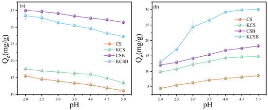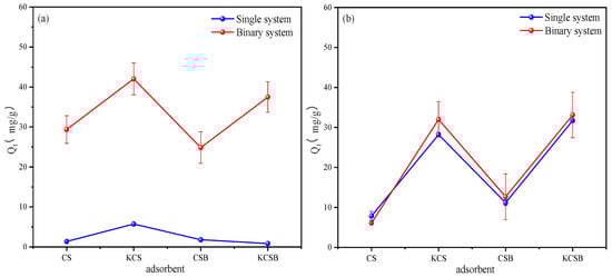 The adsorption amounts of TC and Cu(II) in the single and binary systems using four adsorbents are compared in Figure 4. Figure 4a shows that in the binary system (TC = 20 mg/L, Cu(II) = 20 mg/L), the presence of Cu(II) significantly increases the adsorption amount of TC. Figure 4b shows that the adsorption capacity of Cu(II) by CS is reduced in the presence of TC. This may be due to the competitive adsorption of a large amount of TC with Cu(II), which occupies the site of the biomass, or the increase in particle size of the complex, hindering the diffusion and transfer of copper to the interior. However, the presence of TC enhanced the adsorption capacity of KCS, CSB, and KCSB on Cu(II), indicating that there was a synergistic adsorption process between them. This could be due to the bridging role of TC in the adsorbent adsorption process of copper, which enhances the amount of copper adsorption through the ‘adsorbent-TC-Cu2+’ pathway [17].