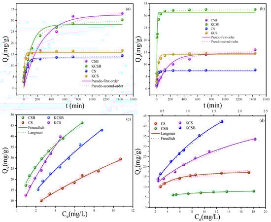 The adsorption kinetics of TC and Cu(II) on four adsorbents are shown in Figure 6a,b, and the kinetic fitting parameters are listed in Table 2. The adsorption of both TC and Cu(II) by all adsorbents follows the quasi-secondary kinetic model, indicating that the rate-limiting step in the adsorption process is the chemisorption of valence forces induced by electron sharing or exchange between the adsorbent and adsorbate [27,36]. A comparison of the quasi-second-order kinetic constants revealed that the adsorption of TC by KCS and KCSB was more rapid than that of Cu(II), indicating that the π–π interaction of TC by KCS and KCSB was more pronounced than that of Cu(II). Moreover, the adsorption of Cu(II) by KCSB was observed to occur at a faster rate than that of KCS, indicating that the surface complexation and ion exchange of Cu(II) by KCSB were more pronounced than those of KCS.