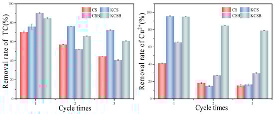 Figure 7 illustrates the reuse effect of four adsorbents on the adsorption of TC and Cu(II). In the experiment, distilled water was used as the regeneration reagent. The results indicate that KCS still had a high adsorption effect on TC after two regenerations, but the removal efficiency of Cu(II) decreased significantly. This reduction in efficiency may be due to pore structure obstruction and a decrease in available adsorption sites. After two regenerations, KCSB demonstrated improved adsorption effects on TC and Cu(II), indicating excellent regeneration performance. In conclusion, KCS and KCSB show great potential for removing TC and Cu(II) from water environments.