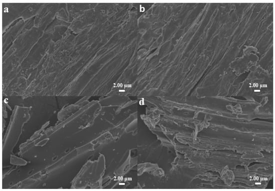 The SEM images, which were used to demonstrate the surface morphology and pore structure of the adsorbents, are illustrated in Figure 1. As seen from Figure 1, the surface of the CS is smooth and flat with grooves, demonstrating a consistent arrangement of tube bundle structure. This suggests that the fiber structure of the corn straw remains intact even after undergoing crushing, cleaning, and other treatments. On the contrary, the surface of KCS becomes rough and the pore size increases. This is mainly due to the damage of the CS tube bundle structure after corrosion by strong alkali. The surface of CSB is smooth and flat, with a small amount of bulge and pore structure in a sheet-like formation. The main reason is that the pyrolysis temperature is 350 °C, and the organic components in the straw form pore structure through partial thermal decomposition, including cellulose, hemicellulose, lignin, carbohydrates, lipids, sugars, and proteins [28], which makes the pores inside CS open, thus increasing the specific surface area and pore size of CSB. The KCSB has a honeycomb structure with raised surfaces and increased pore size. The pore size increases because KOH corrodes the pore wall of CSB, which clears blockages in the pore structure and enhances adsorption [24].