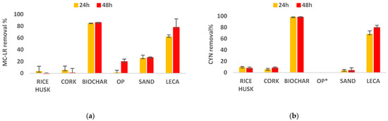 Biochar and LECA showed highest sorption potential of both MC-LR (100 µg/L) and CYN (300 µg/L) (Figure 1). Highest MC-LR sorption rates were >86% by biochar, with MC-LR levels <LOD; and an average 62% and 78% by LECA at 24 h and 48 h, respectively (Figure 1a). The highest CYN sorption rates were >98% by biochar, with CYN levels <LOD; and an average 68% and 80% by LECA at 24 h and 48 h, respectively (Figure 1b). Controls showed no sorption of both compounds, and for simplification, this is not included in Figure 1. Tables including data and statistics are provided in the Supplementary Materials (Tables S2 and S3).
