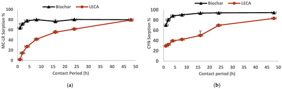 Sorption kinetics of MC-LR (a) and CYN (b) on biochar and LECA (mean and standard deviation, n = 3).