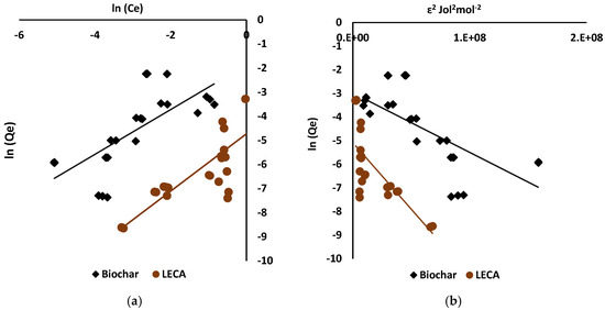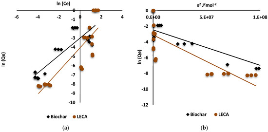 Sorption isotherm plots of MC-LR onto LECA and biochar: (a) Freundlich and (b) D–R.