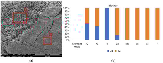Two perspectives of the biochar could be observed in the SEM image (Figure 5a). The horizontal part of the biochar represented the smooth part of the wood, or the surface (Z2), and the vertical part represented the longitudinal part of the wood that has channels (Z1). The latter part had more pores than the former. Differences in the element composition can be observed in both parts as well (Figure 5b and Figure S10a,b).