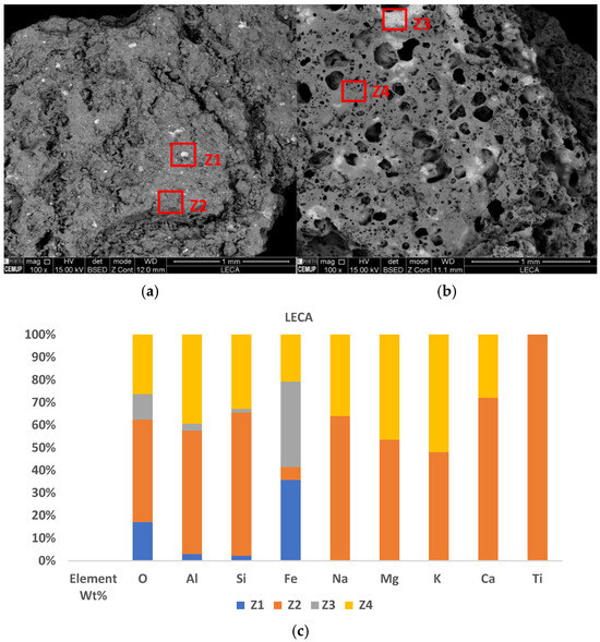 Since LECA was broken down, there were differences in surface morphologies and element composition in the outer (brown) (Figure 6a) and inner (grey) (Figure 6b) parts. The difference in element composition on the outer and inner surfaces can be seen in the backscattered electron diffraction mode SEM images (Figure 6a,b), the stacked column graph (Figure 6b), and the EDS graphs (Figure S9a–d). The brighter spots on the SEM image (Z1 and Z3) denote the concentration of elements of higher atomic number, and the darker spots on the SEM image denote the concentration of elements of lower atomic number, in the respective areas.
