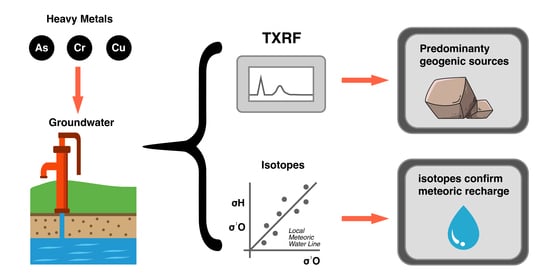 This research presents the first integrated hydrogeochemical and isotopic evaluation of rural groundwater and soil in Tonosí, Panama, emphasizing not only heavy metal presence but also stable isotope signatures (δ2H and δ18O) that confirmed meteoric recharge and limited evaporative influence in groundwater and soil samples from Tonosí, Panama—a locality with scarce previous environmental oversight. Employing a multidisciplinary approach that integrates TXRF elemental analysis, stable isotope profiling, soil enrichment indices (EF), TEL/PEL risk thresholds, and granulometric characterization, the study produced several important findings: