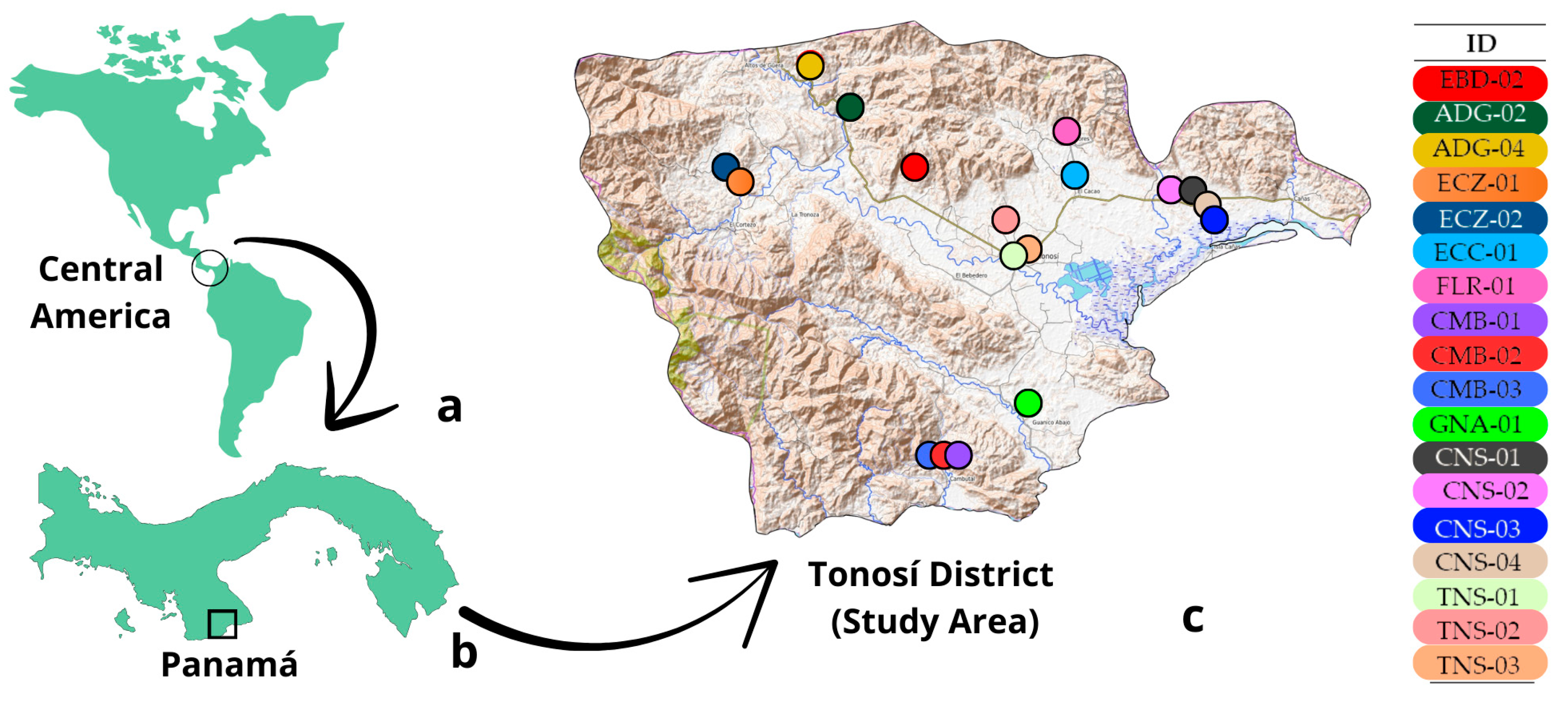 The research took place in the Tonosí district, situated in the Los Santos Province on the Pacific side of Panama. This mainly rural area supports its residents via small-scale farming and animal husbandry. The geology of Tonosí features sedimentary and volcanic formations, with alluvial deposits found in the low-lying regions. According to Dr. Alberto McKay’s climatic classification, which is based on Emmanuel de Martonne’s typology, the Tonosí River basin includes three climate types with unique spatial distributions [