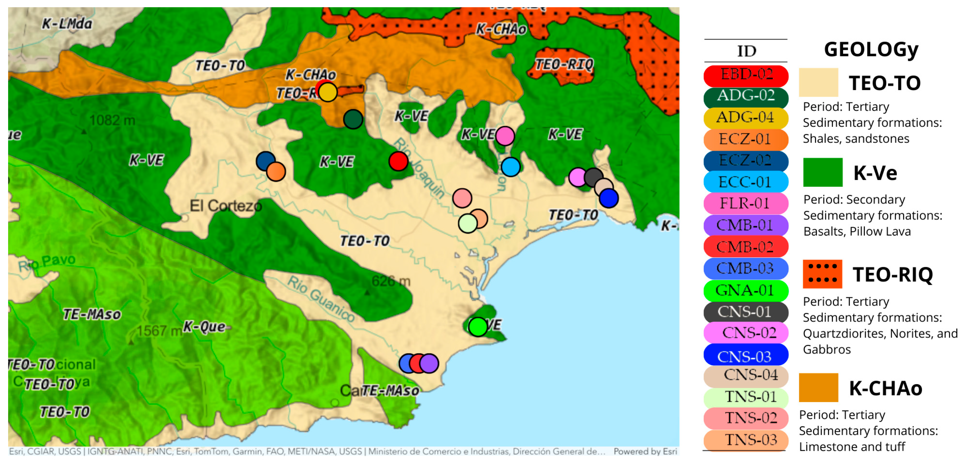 15]. The geochemical signatures observed in groundwater are consistent with the local geology of Tonosí, which includes Cretaceous volcanic and ophiolitic units (K-Ve, K-CHAo) and Eocene-Oligocene tonalitic and rhyolitic intrusions (TEO-TO, TEO-RIQ). These lithologies naturally contribute elements such as Cr, Ni, Fe, and Mn, supporting the interpretation of predominantly geogenic metal sources in the study area.