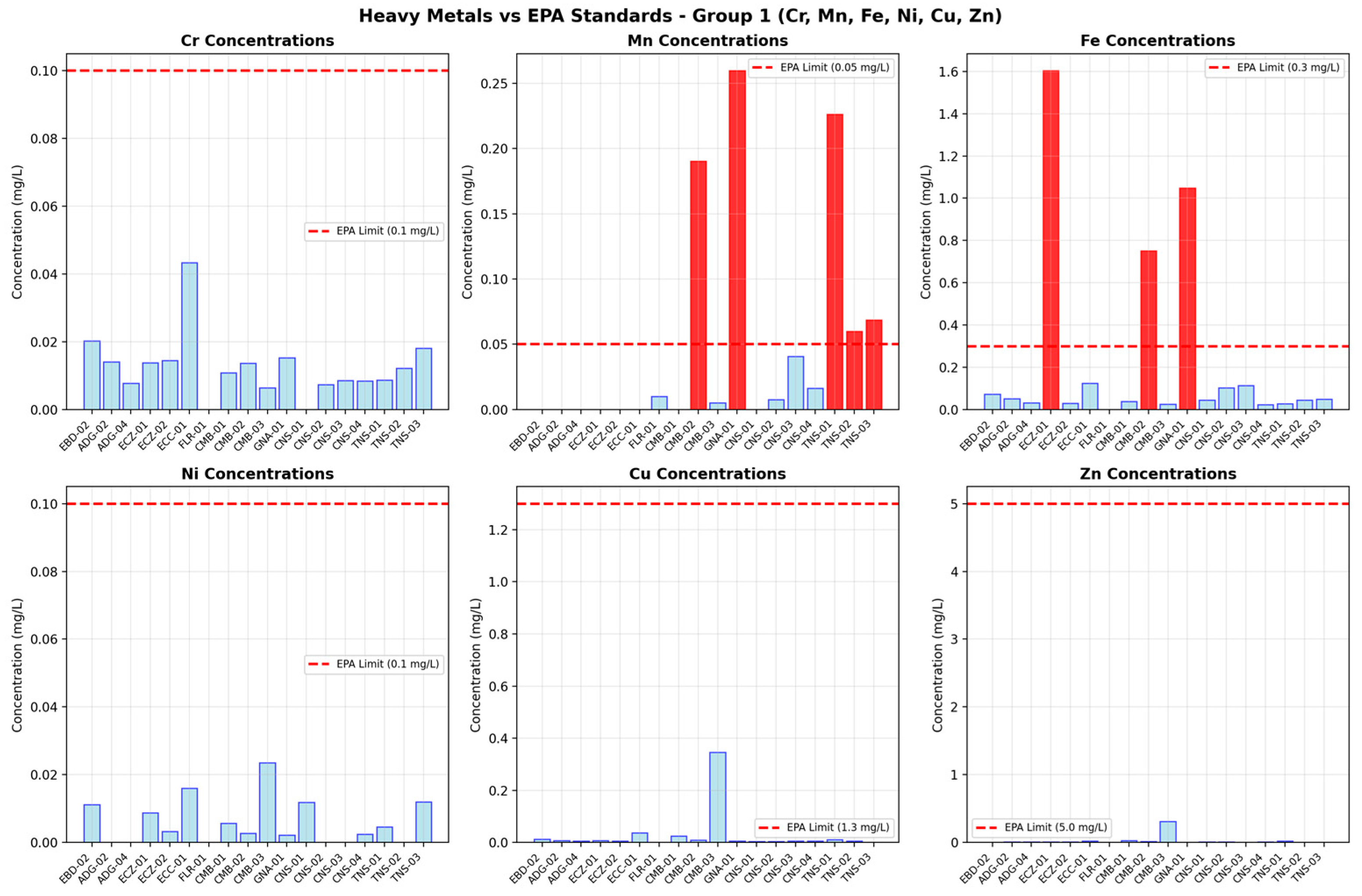 6]) drinking water standards, although sporadic anomalies were observed for Mn, Fe, Sb, and Ag in specific sites. These exceedances underline the importance of site-specific monitoring to safeguard human health.