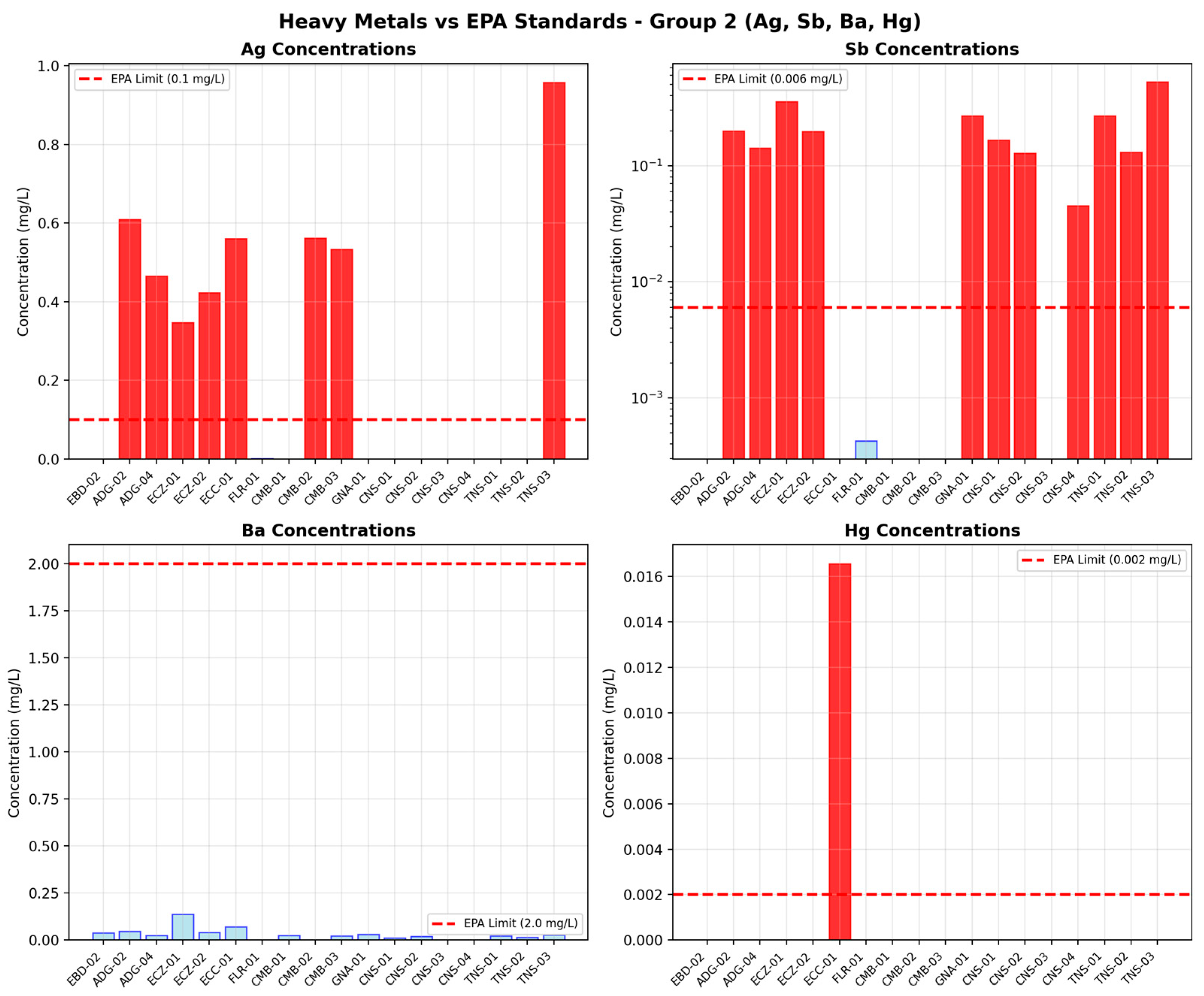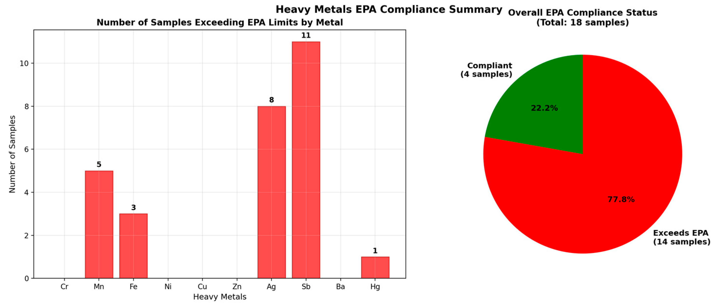Figure 6 illustrate the comparison of metal concentrations with EPA standards, highlighting exceedances for Mn, Fe, Sb, Ag, and Hg in selected sites, and provide an overall compliance summary across all samples.