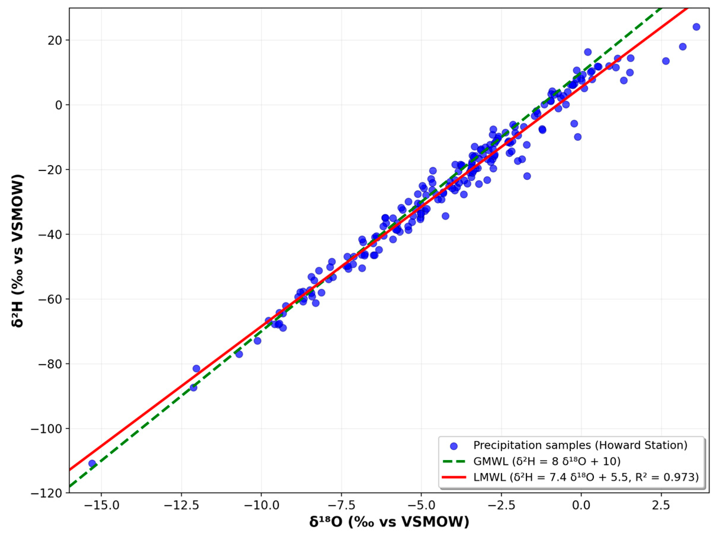 13] at Howard Station, Panama, were utilized to develop the Local Meteoric Water Line (LMWL) for comparative studies. Linear regression and ANCOVA were performed to evaluate isotopic trends and statistical differences among water sources.