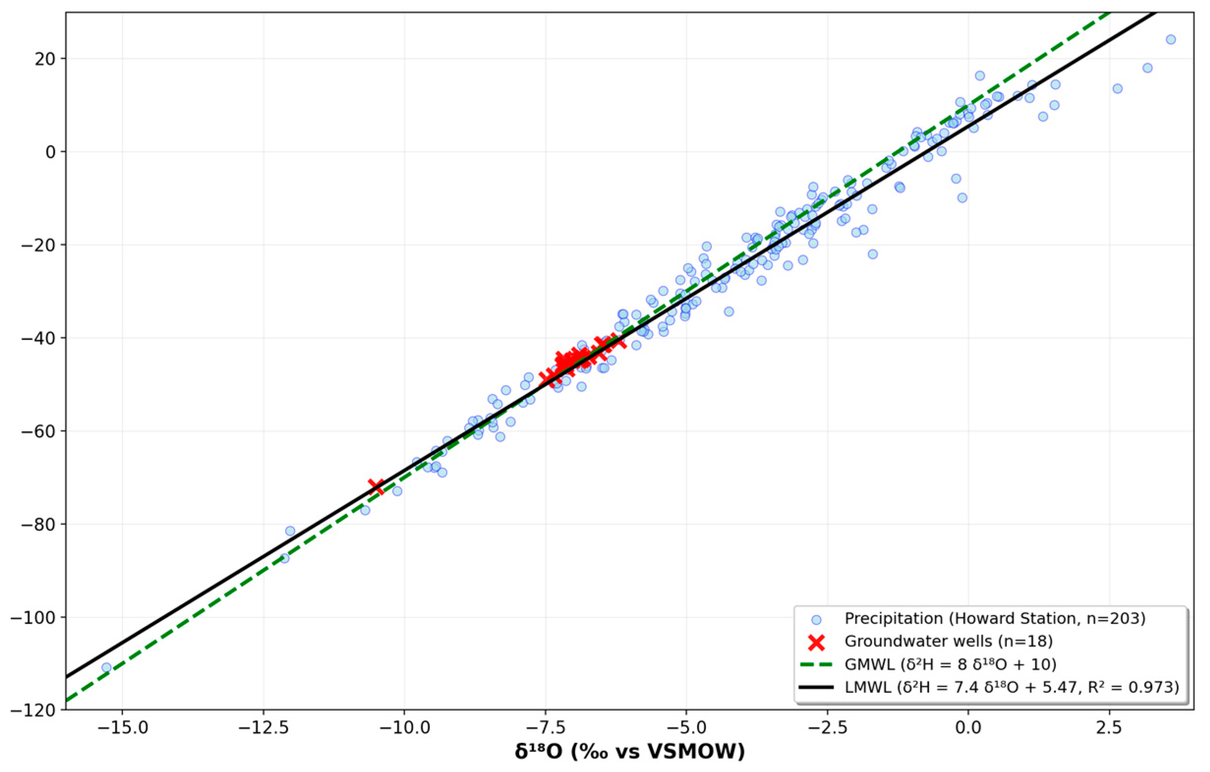 The Local Meteoric Water Line (LMWL) was constructed using historical data from the Global Network of Isotopes in Precipitation (GNIP) for the Howard station in Panama. Linear regression models of δ2H vs. δ18O were generated separately for precipitation, groundwater wells, and spring discharge points.