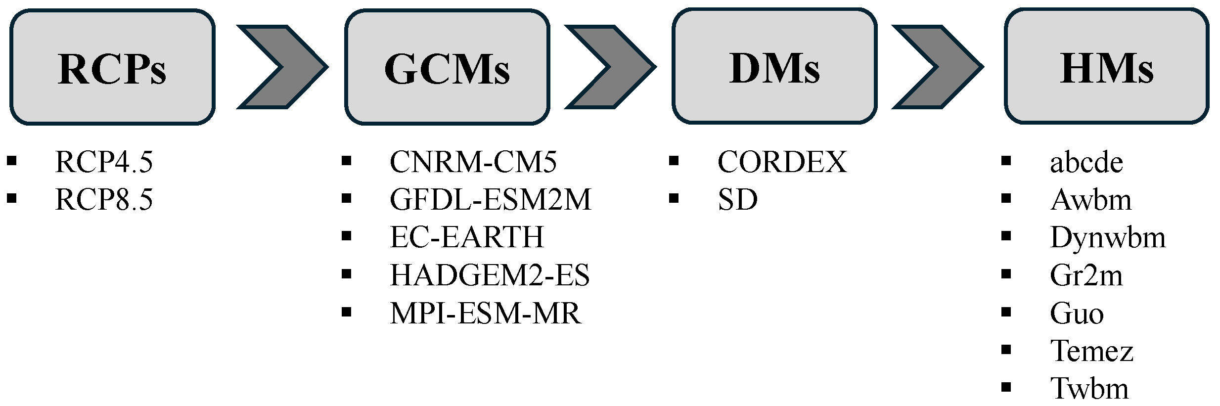- Wang, H.M.; Chen, J.; Xu, C.Y.; Zhang, J.; Chen, H. A framework to quantify the uncertainty contribution of GCMs over multiple sources in hydrological impacts of climate change. Earth’s Future 2020, 8, e2020EF001602. [Google Scholar] [CrossRef]