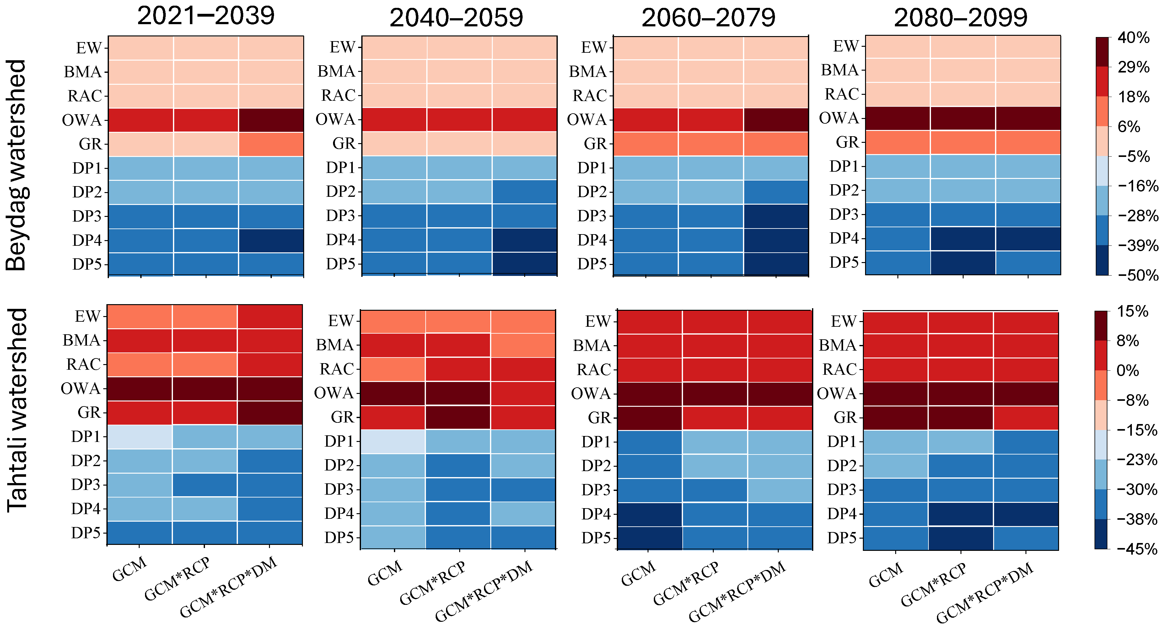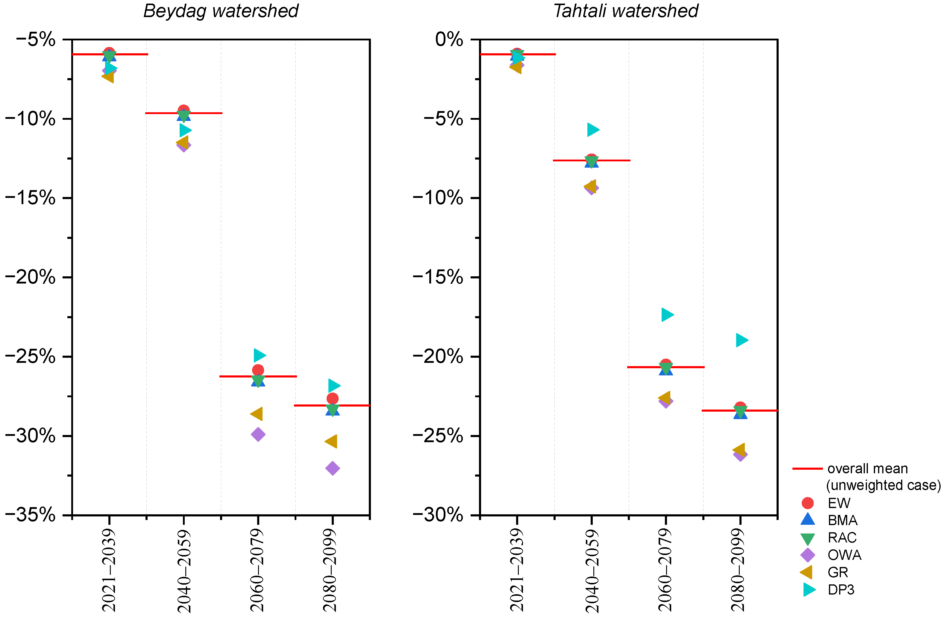 - Duan, K.; Wang, X.; Liu, B.; Zhao, T.; Chen, X. Comparing Bayesian model averaging and reliability ensemble averaging in post-processing runoff projections under climate change. Water 2021, 13, 2124. [Google Scholar] [CrossRef]