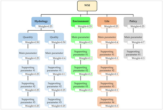 Pressure, state, and response scores are identified for each main and supporting parameter using the tables provided above. The final score for the relevant parameter is calculated by taking the average of these scores. Then, the final score for each parameter is multiplied by its assigned weight and added up. In the environment, life, and policy indicators, this process directly produces the resulting score, while in the hydrology indicator, it creates the scores for the quantity and quality sub-indicators. The scores of these sub-indicators are multiplied by their weights to create the hydrology score. In the last step, the hydrology, environment, life, and policy indicators are multiplied by their weights and summed to obtain the WSI. The weights of the parameters are presented in Figure 1, and the values assigned to the main and supporting parameters were identified based on the characteristics of the studied watershed. However, it is possible to rearrange these weights for more meaningful or effective parameters in different watersheds.