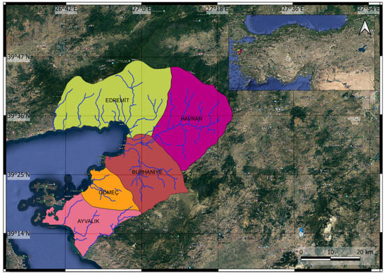 The Central North Aegean Basin of Türkiye was chosen as the case study area due to its intensive agricultural activities and high tourism potential. The basin with an area of 2224 km2 covers five districts of Balıkesir province (Ayvalık, Burhaniye, Edremit, Gömeç, and Havran) (Figure 2). Since climatic conditions and soil characteristics are favorable in the basin, it is possible to grow various crops. Edremit, Havran, and Burhaniye plains especially have high agricultural value. The basin is one of the regions with the highest olive production in Türkiye [27]. Livestock activities are quite common in the high parts of the province, such as pastures and meadows. Although a Mediterranean climate is observed throughout the province, the effect of a continental climate is felt towards the interior [28].