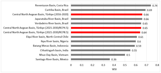 The impact of climate change on watershed vulnerability is becoming more critical, as noted in policymakers’ work. The U.S. Environmental Protection Agency has conducted watershed assessment studies to evaluate the vulnerability of watershed health to future degradation. A single vulnerability index is developed from sub-indices characterizing potential risks (including future climate, land use, water use change, and wildfire risk). Although there are some studies in the literature that examine the effects of climate change on the environment or watershed hydrology [16,17], the literature focusing on the direct effects of climate change on WSI is limited. However, the increasing number of studies investigating the effects of climate change on basin vulnerability [18,19] using data from the IPCC 6th Assessment Report [1] supports the approach of the present study. The IPCC 6th Assessment Report [1] emphasizes the importance of improving water management practices, promoting efficient and economical water use, and taking urgent measures within the scope of climate change adaptation and mitigation. It also points out the need for an assessment approach that includes economic, social, and management aspects of water-related adaptations.