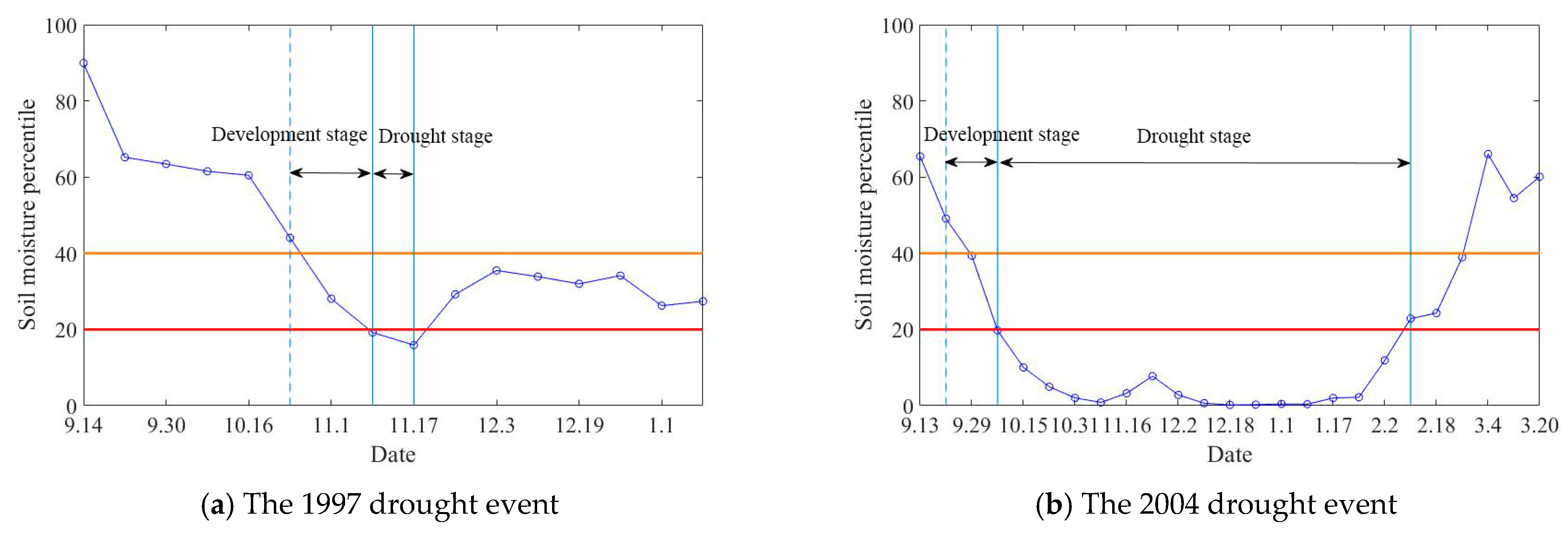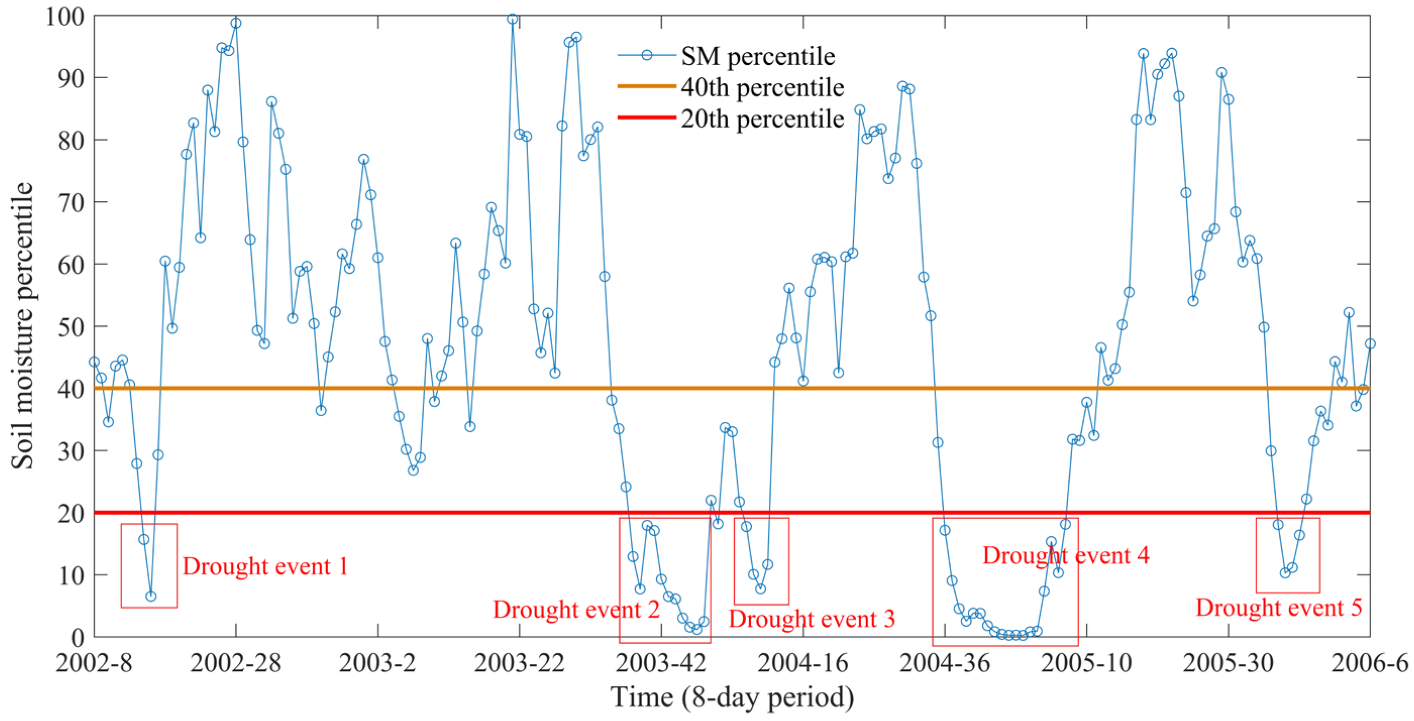 15]. Accordingly, the 20th percentile of soil moisture is used as the threshold for identifying drought events [