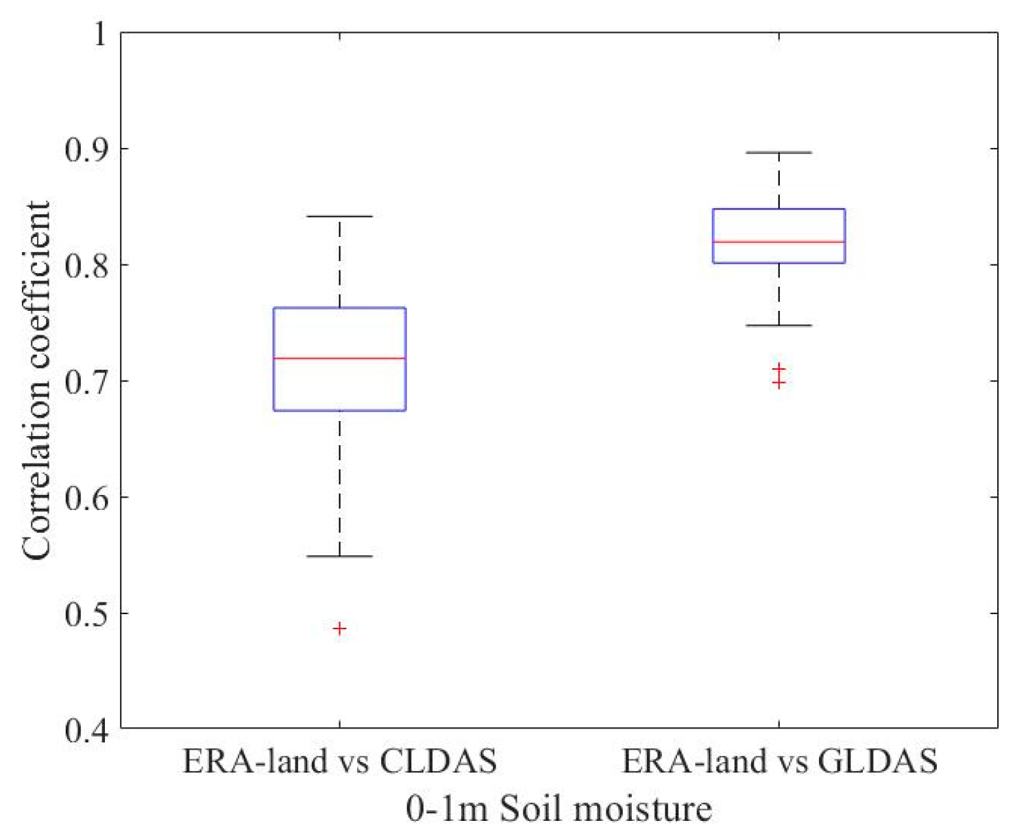 Correlation coefficients of ERA-land 0–1 m soil moisture against CLDAS and GLDAS.