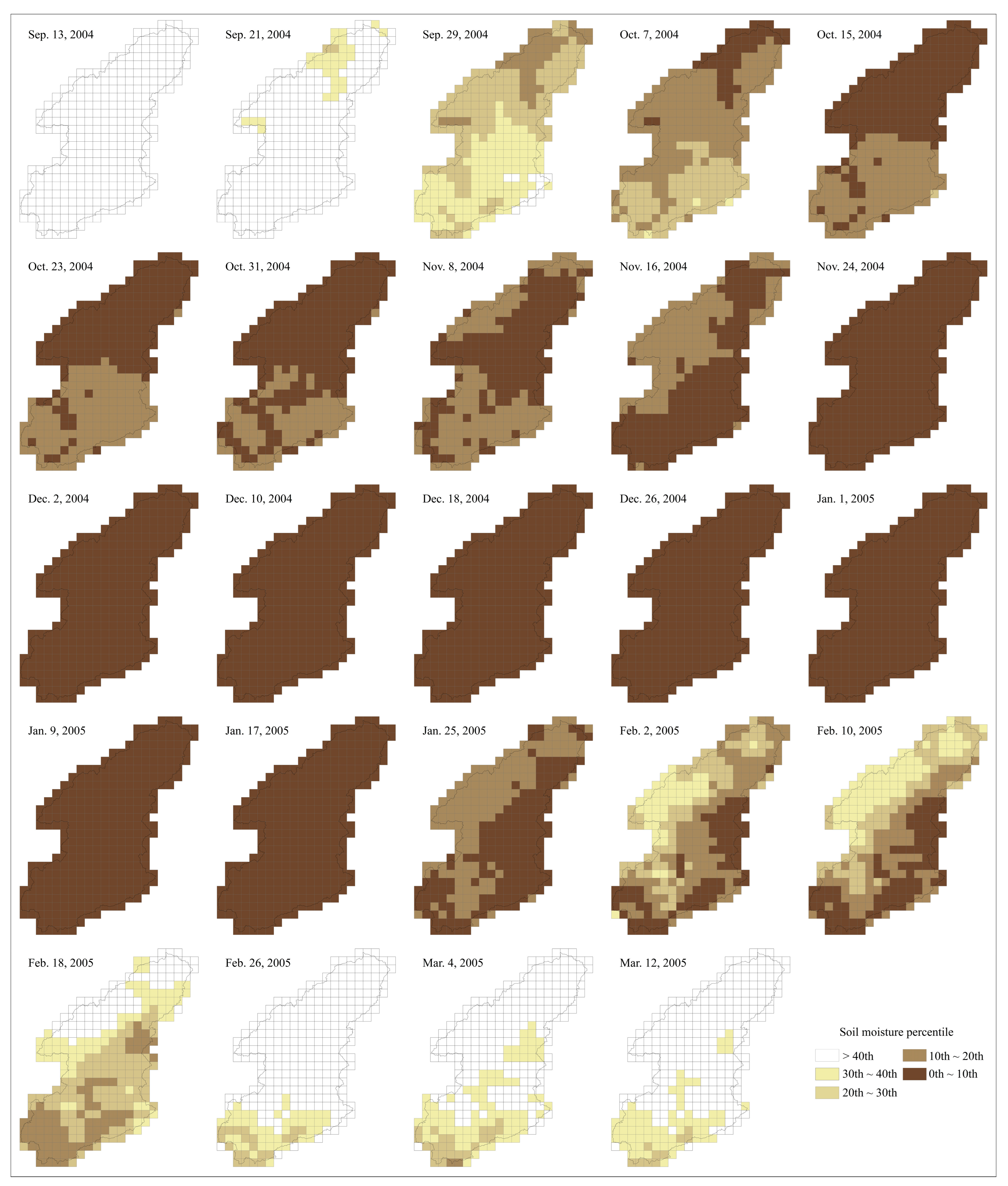 Spatial evolution of the 2004 drought event in the Dongjiang River Basin.