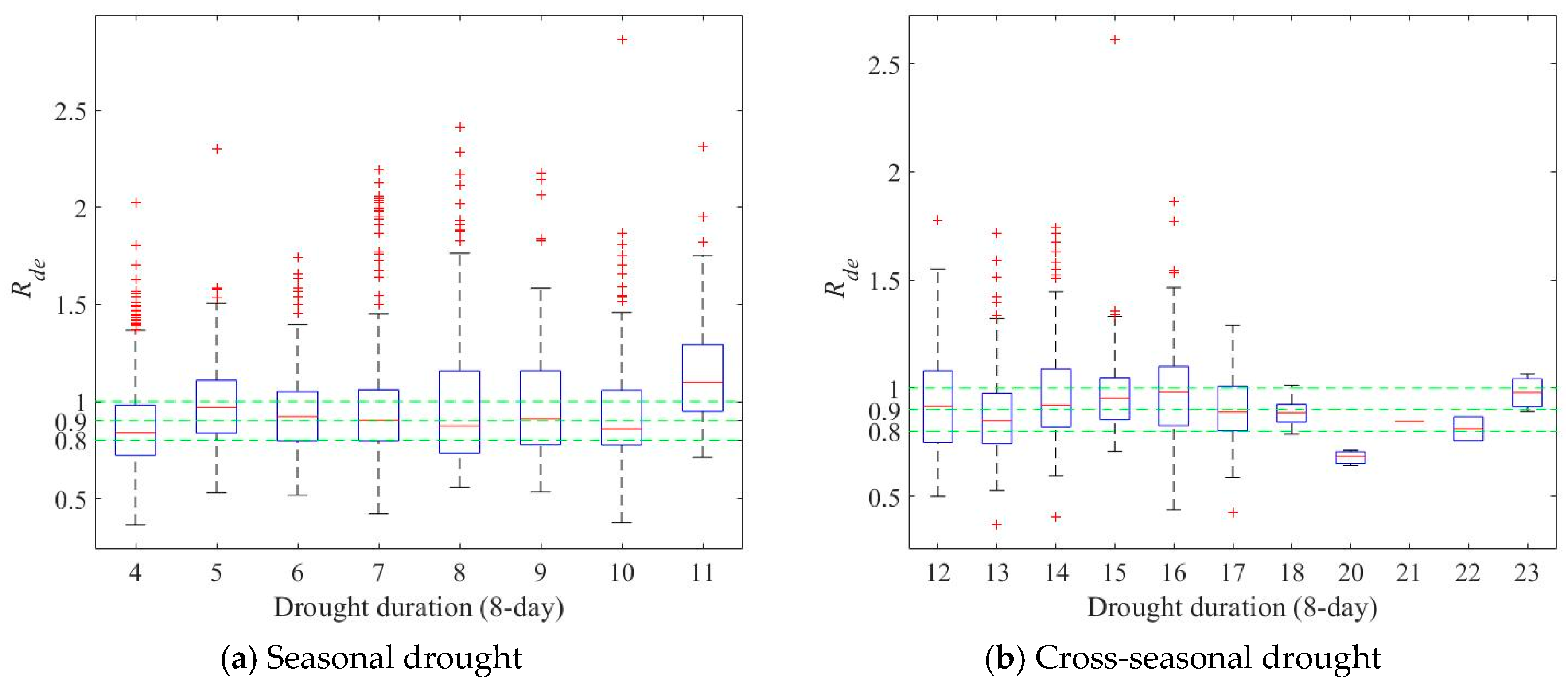 Relationship between drought duration and Rde for (a) seasonal drought and (b) cross-seasonal drought (evolved from non-flash drought) in the Dongjiang River Basin.