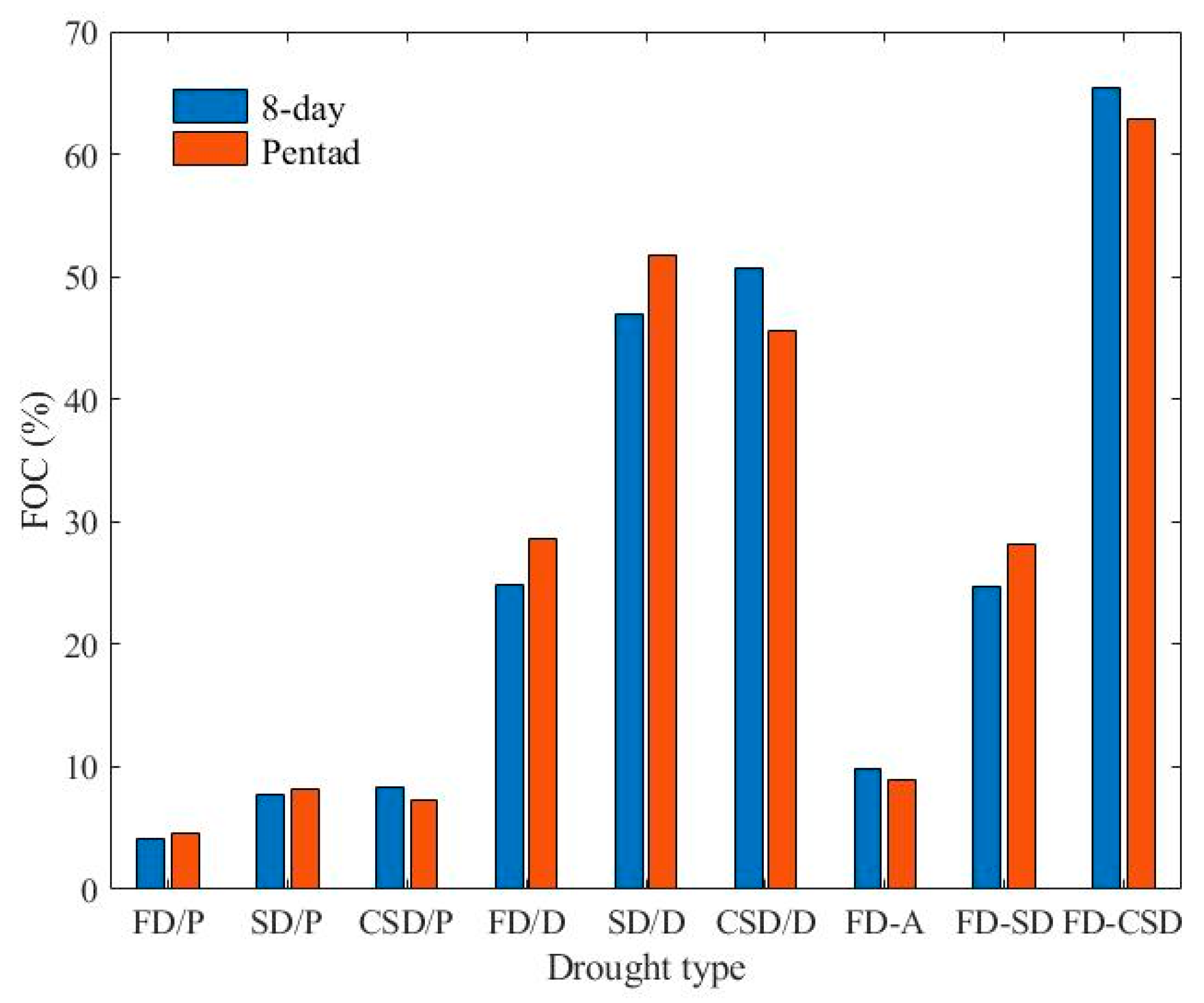 Comparison of the occurrence frequency of different types of droughts identified using the 8-day scale and the pentad scale. /P denotes the proportion of a specific drought type relative to all time units, and /D represents the proportion of a specific drought type relative to the total number of drought events.
