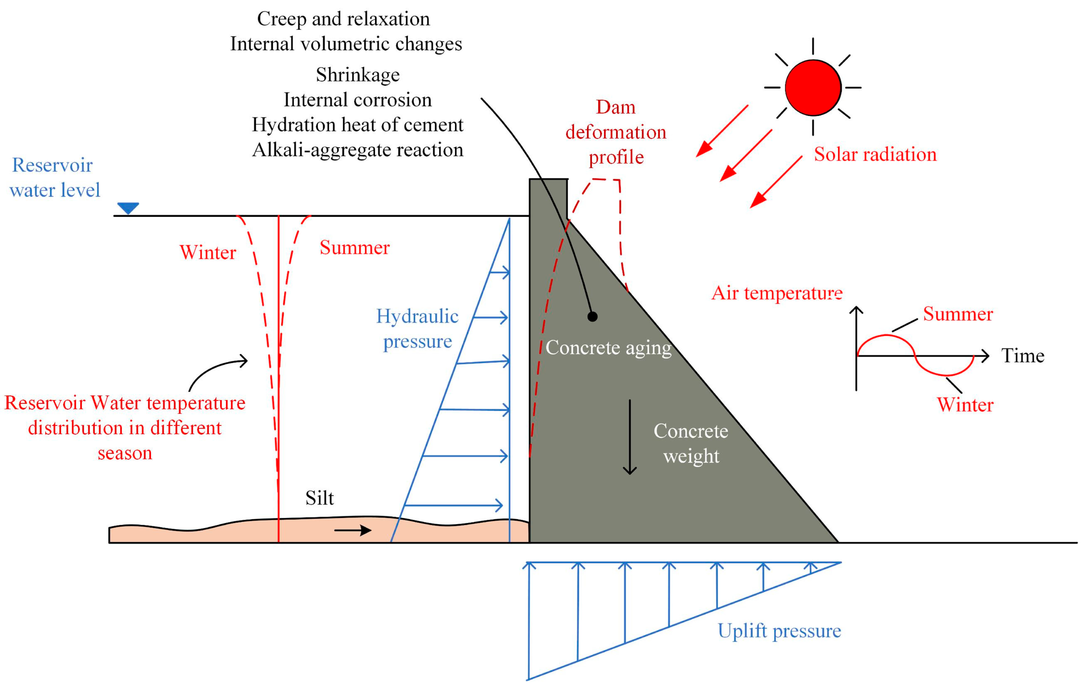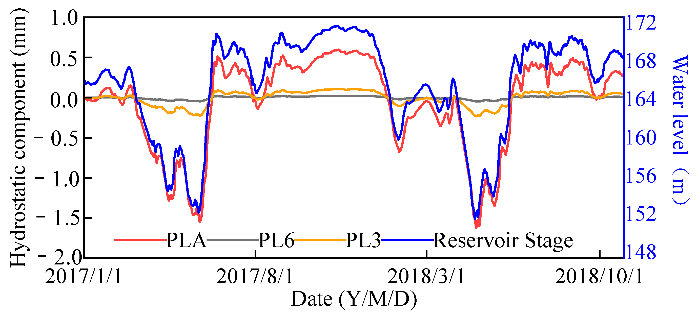 - Yang, G.; Gu, H.; Chen, X.; Zhao, K.; Qiao, D.; Chen, X. Hybrid hydrostatic-seasonal-time model for predicting the deformation behaviour of high concrete dams during the operational period. Struct. Control. Health Monit. 2021, 28, e2685. [Google Scholar] [CrossRef]