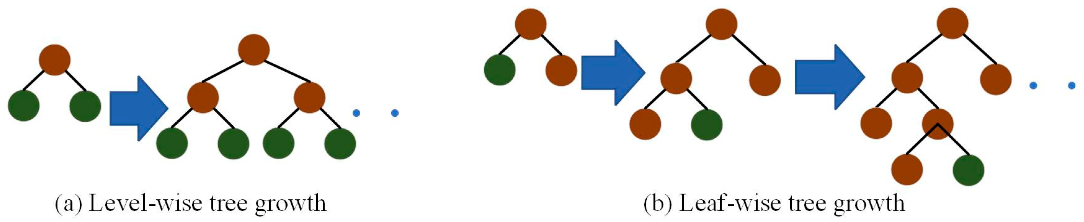 - Ke, G.; Meng, Q.; Finley, T.; Wang, T.; Chen, W.; Ma, W.; Ye, Q.; Liu, T.Y. Lightgbm: A highly efficient gradient boosting decision tree. In Proceedings of the 31st International Conference on Neural Information Processing Systems, Long Beach, CA, USA, 4–9 December 2017; pp. 3149–3157. [Google Scholar]
