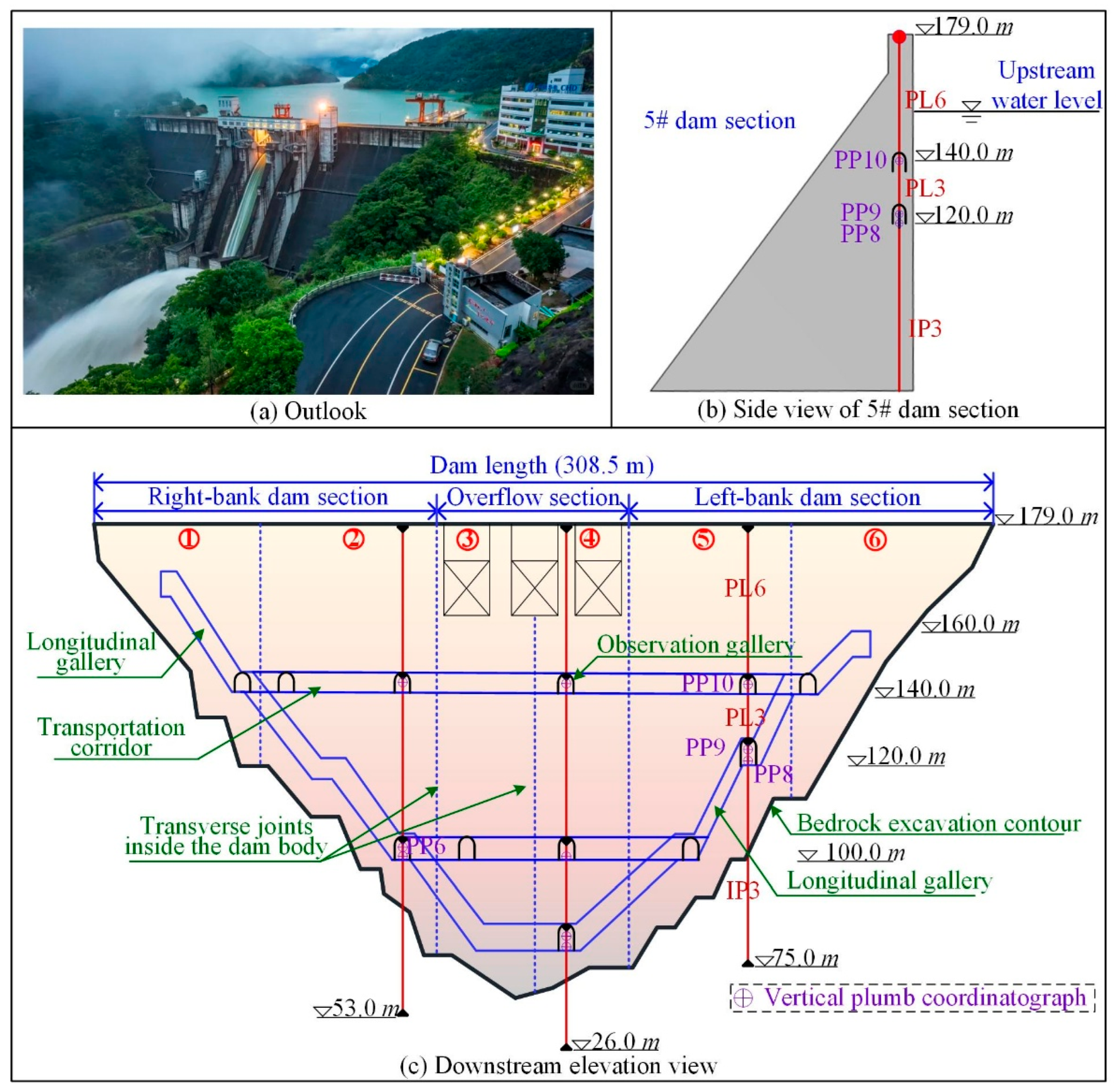 - Wang, S.; Gu, C.; Liu, Y.; Wu, B.B. Displacement observation data-based structural health monitoring of concrete dams: A state-of-art review. Structures 2024, 68, 107072. [Google Scholar] [CrossRef]