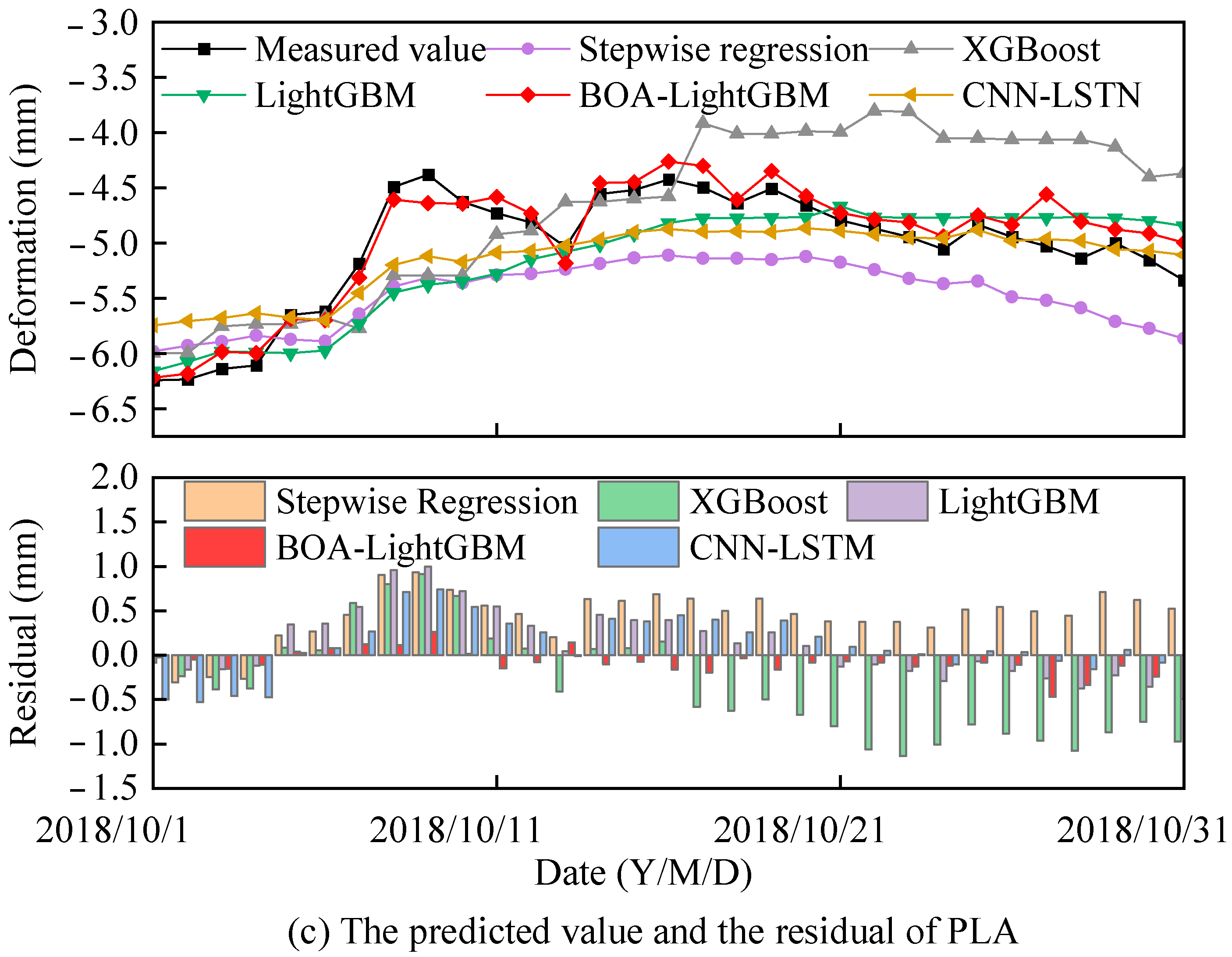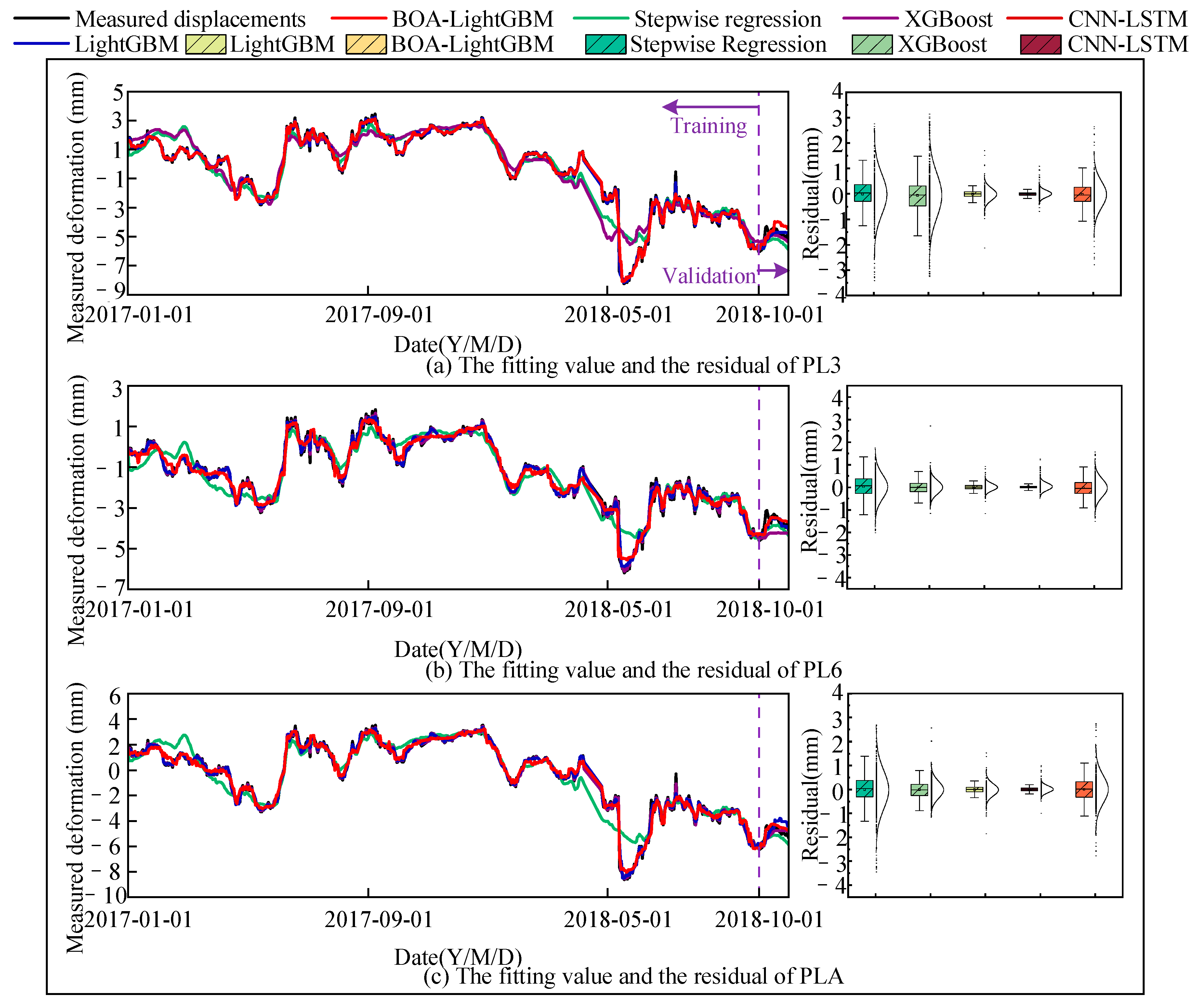 - The proposed hybrid multi-point deformation monitoring model incorporates spatial coordinates and FEM-assisted components, effectively capturing spatial correlations of dam deformation. Combined with BOA-LightGBM, it achieves accurate representation of nonlinear relationships, significantly enhancing fitting and prediction performance.