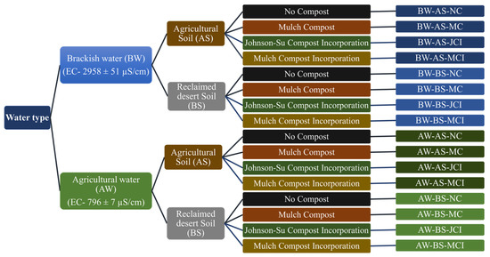 Overview of the experimental design showing the combination of two water types (brackish and agricultural), two soil types (agricultural soil and reclaimed desert soil), and four compost treatments: no compost (NC), mulch compost surface application (MC), Johnson-Su compost incorporation (JCI), and mulch compost incorporation (MCI). Each combination is labeled accordingly, resulting in a total of 16 treatment groups, each with three replicates.