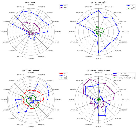 SO42− leaching reached its highest in BW-BS-MCI (11476 ± 373 mg) and lowest in AW-AS-MCI (849 ± 78 mg), with significant main and interaction effects (IW × S and IW × S × C) (p = 0.000) (Table S2). SO42− is essential for plant protein synthesis and enzyme function [54]. High SO42− can damage the root system and reduce plant growth by hindering NO3− uptake and reducing microbial activity in the soil [55]. Sulfur nutrient availability regulates root elongation by affecting root indole-3-acetic acid levels and the stem cell niche [56]. Therefore, SO42− leaching in treatments with BW-BS, BW-AS, and AW-BS, can be beneficial in preventing sulfate toxicity and maintaining a balanced nutrient profile in the soil (Figure S1).