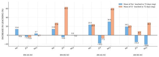 The percentage increase (Equation (4)) in the leaching of Na+ and Cl− ions over 72 days, varying with different types of compost incorporation for different types of irrigation water and soil, compared to no-compost (NC) columns, is displayed in Figure 3.
