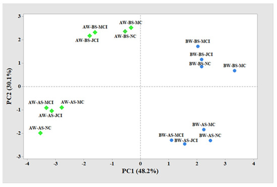 This indicates that treatments with high values in PC1 are characterized by higher leaching of Na+, Cl−, and SO42−, as well as higher SAR values. This reflects the salinity-sodicity gradient driven by BW irrigation and saline soil conditions. High values in PC2 were characterized by higher SAR in 7 days values, whereas lower values of PC2 and PC2 were indicated by higher NO3− and NO2. Treatments such as BW-BS-NC, BW-BS-MC, BW-BS-JCI, and BW-BS-MCI were clustered on the positive side of PC1 and PC2, indicating higher ion leaching responsible for salinity issues associated with BW and BS combinations.