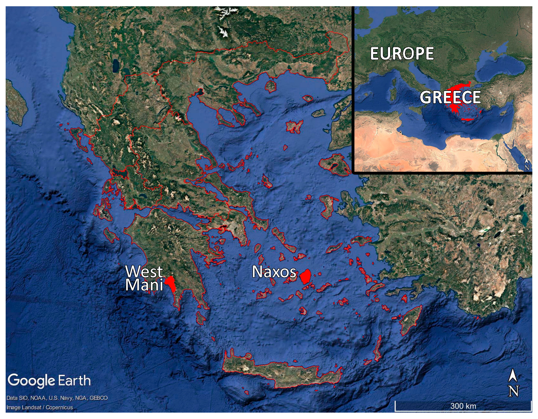 - Municipality of Naxos and Small Cyclades. Population. Available online: https://bluemunicipalities.org/en/municipality/naxos/ (accessed on 7 October 2025).