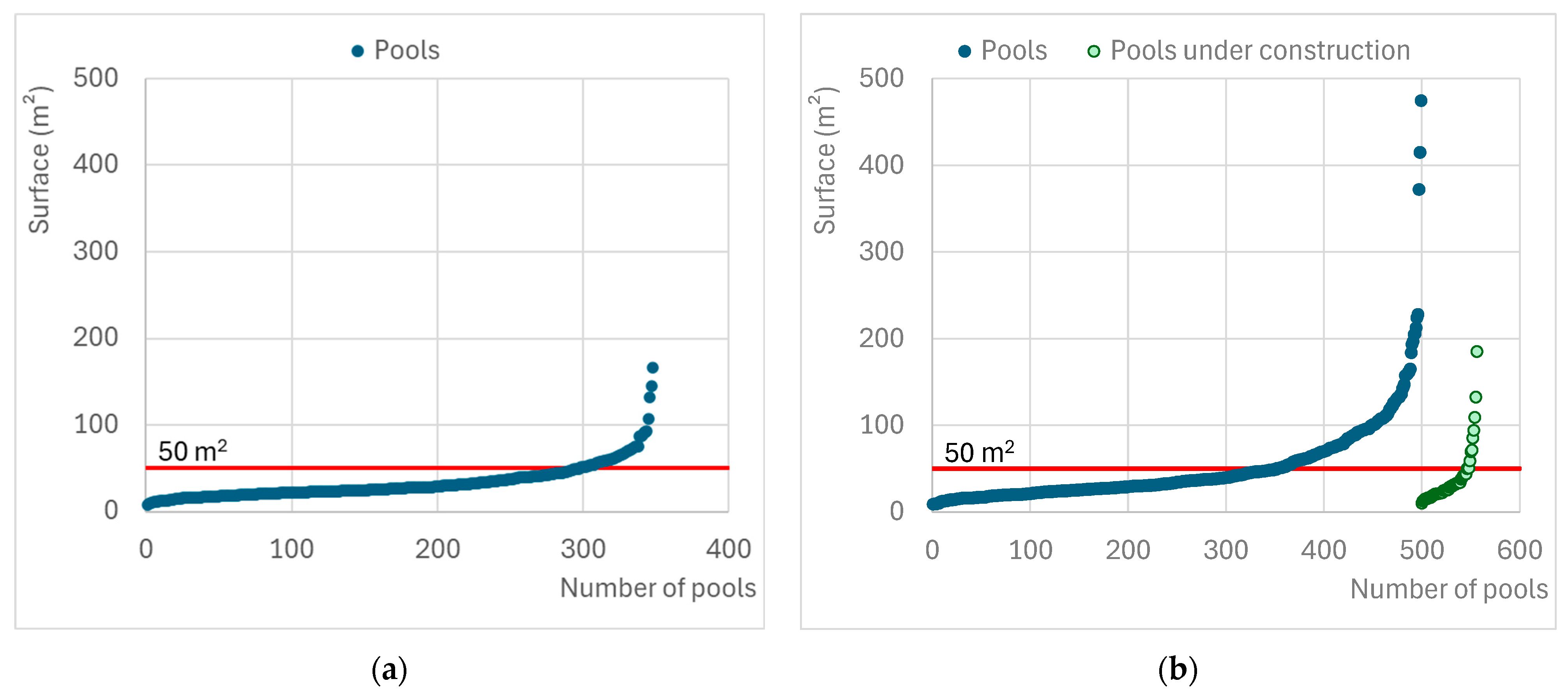 3.1. Satellite-Derived Estimation of the Pools’ Surface Areas