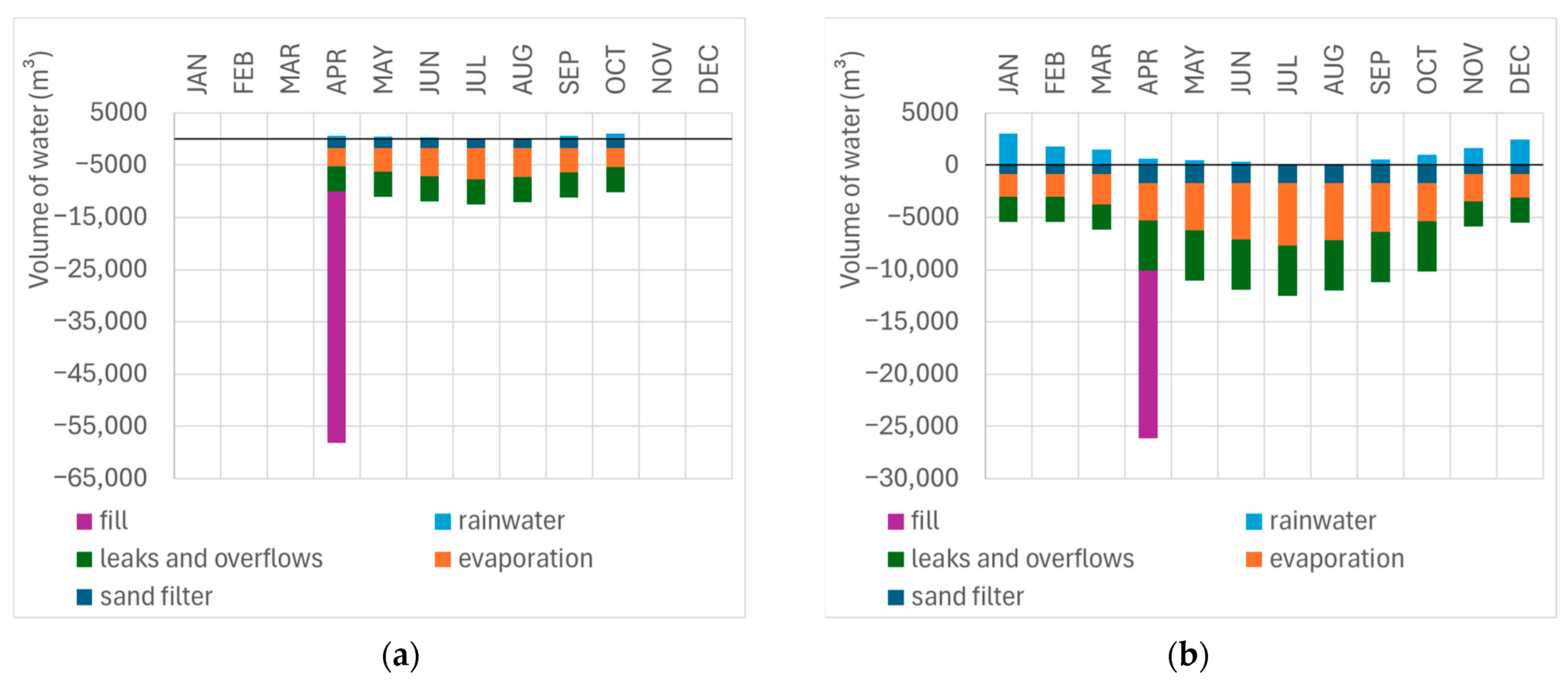 - Scenario 2 (partial renewal): pools remain filled year-round, with approximately one-third of the volume replaced annually, in line with standard maintenance guidelines.
