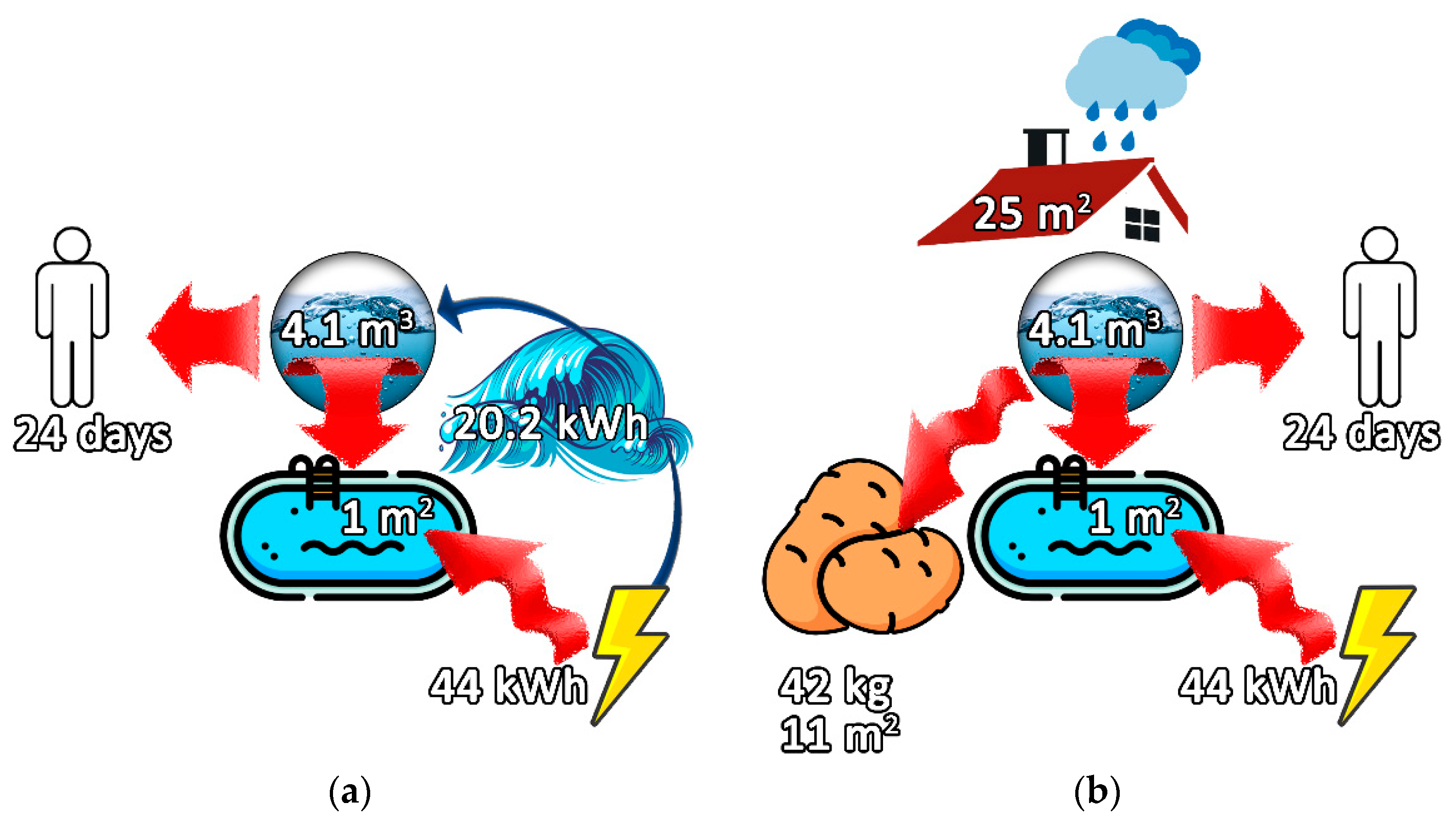 - Minimum water needs: These are estimated at 18.5 m3 per year (which corresponds to 50 L/day) [31].