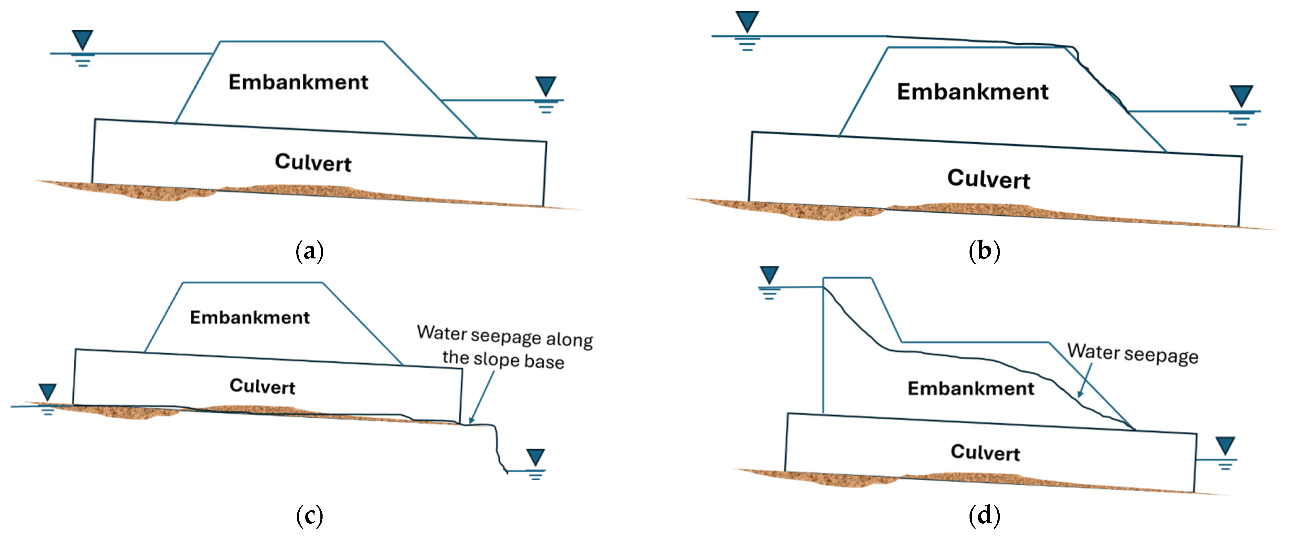 - Offset Head Floods. Offset head development occurs when highway embankments act as temporary dams, as shown in Figure 1a. In this scenario, water accumulates on one side of the embankment, with only partial drainage through the culvert. This can lead to internal soil erosion within the embankment. The combination of water head differences and internal erosion may result in partial or complete embankment failure.