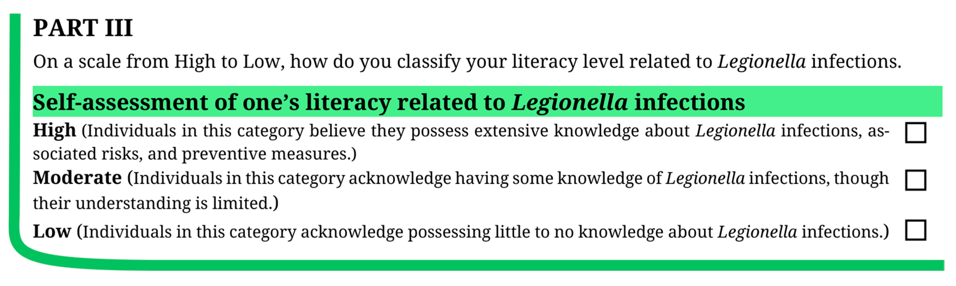 Legionella infections. Regarding educational attainment, the results suggest that participants with lower levels of education tend to report low or moderate literacy, whereas those with higher qualifications tend to report high literacy. This pattern contrasts with Abu-Shakra [