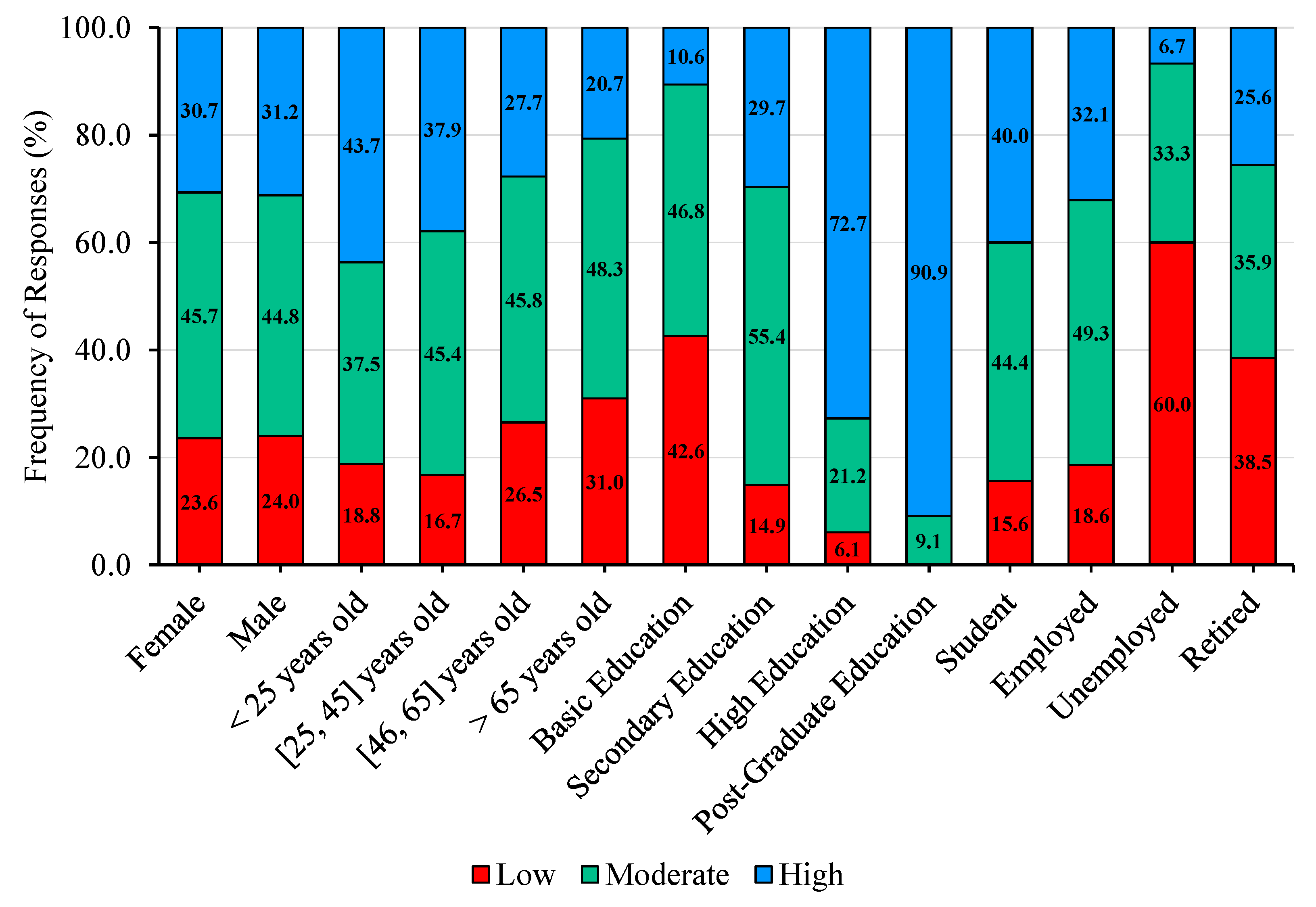 51], who found that education had a limited effect on literacy, possibly reflecting contextual or methodological differences between the studies. Finaly, a pattern emerges in which the percentage of participants reporting high literacy decreases among the unemployed and retired, while the proportion reporting low literacy increases. Conversely, students and employed participants exhibit the opposite trend. Overall, the findings highlight variations in self-assessed literacy according to socio-demographic factors, including age, educational attainment, and work status, suggesting that life experience, educational background, and professional engagement play a role in shaping participants’ knowledge about