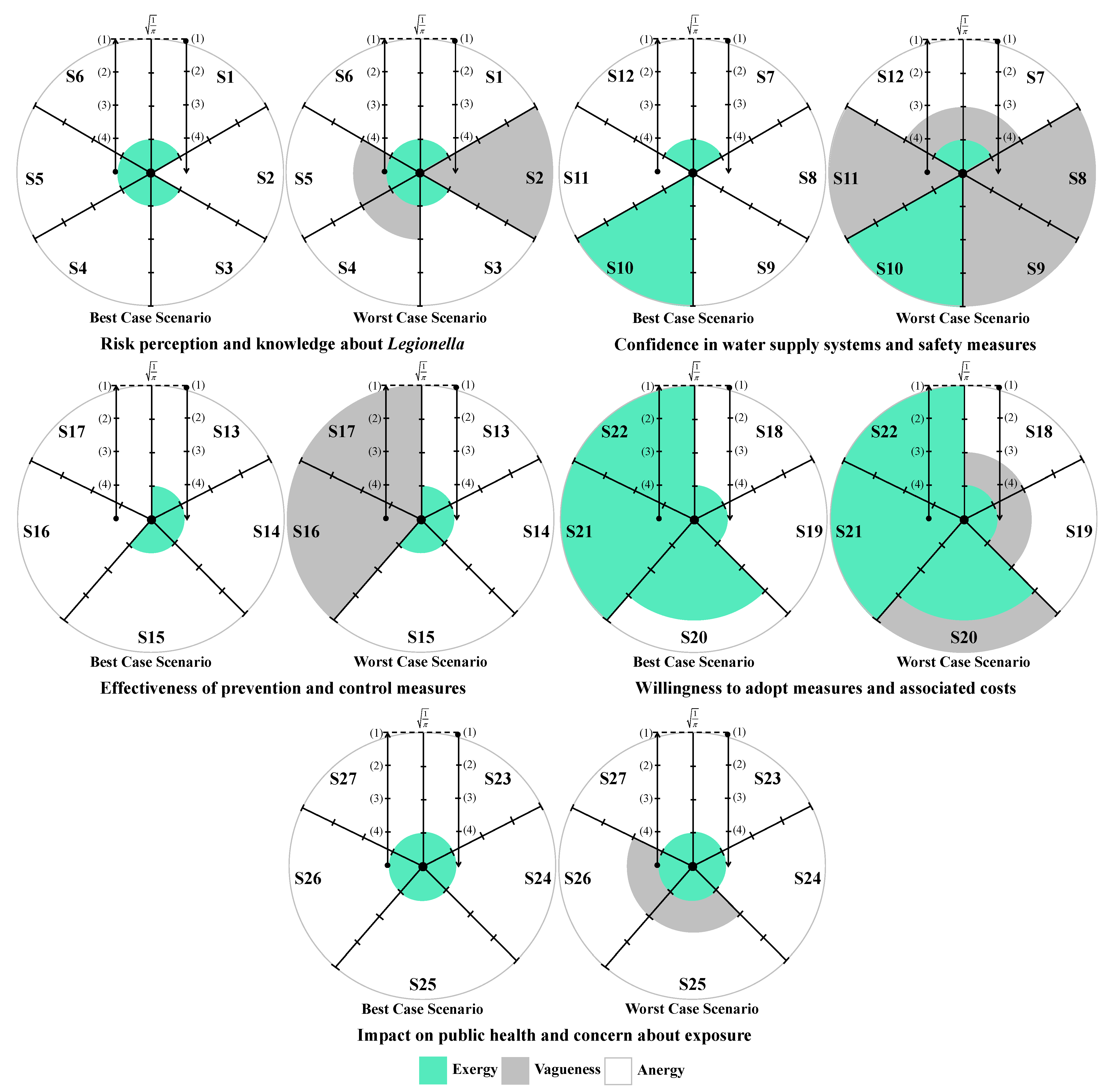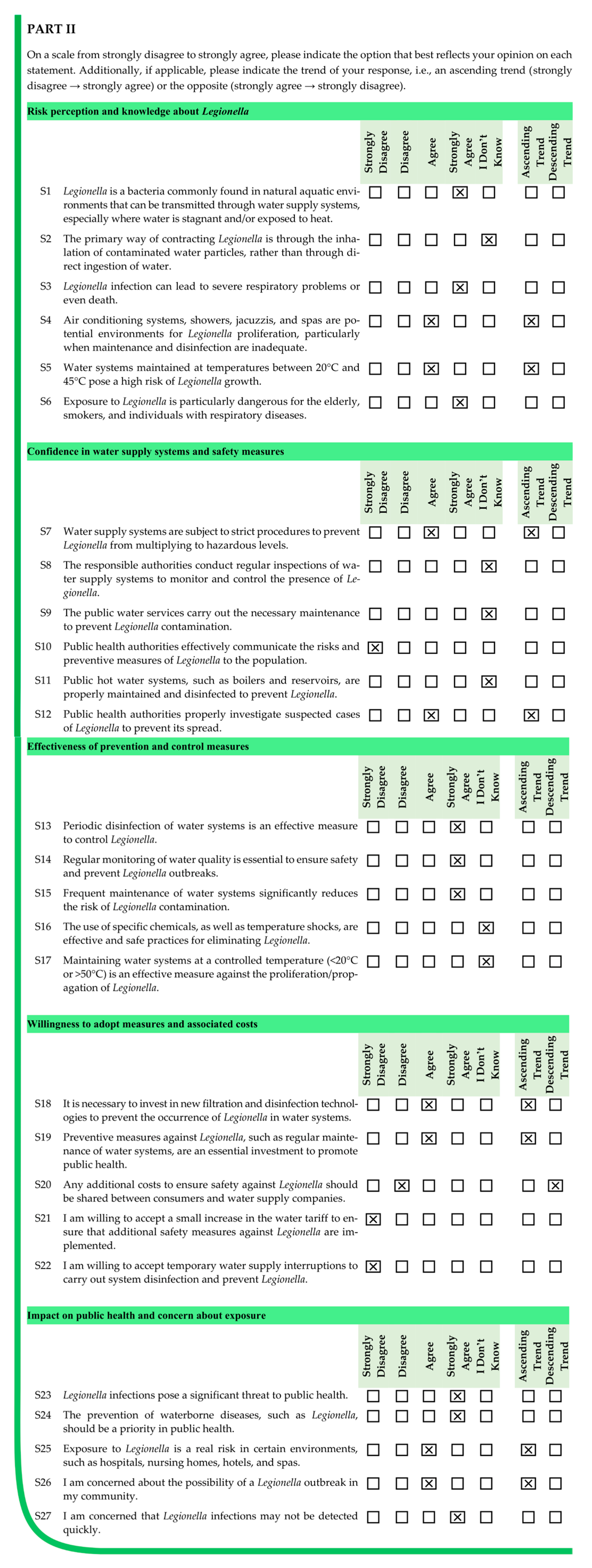 The analysis of participants’ responses reveals a generally high level of risk perception and knowledge regarding Legionella infections, indicating awareness of the severity and potential health impacts of the disease. Despite this, critical gaps persist, particularly in understanding the main transmission pathways and the influence of temperature on bacterial growth. These gaps suggest that targeted educational interventions are needed to reinforce knowledge on key aspects of infection dynamics and environmental factors that facilitate bacterial proliferation. With regard to confidence in water supply systems and associated safety measures, responses were heterogeneous. While certain procedures, such as the investigation of suspected cases by authorities, were positively recognized, substantial disagreement and uncertainty were observed regarding risk communication and routine maintenance practices. This highlights the importance of not only maintaining safe infrastructure but also providing transparent and clear information to foster public trust and understanding. Regarding the perceived effectiveness of prevention and control measures, participants generally acknowledged disinfection, maintenance, and technological interventions, though some information gaps were observed. Clear explanations regarding the rationale and expected outcomes of these measures may support greater understanding and engagement. Participants’ willingness to adopt preventive measures involving financial costs or service disruptions was limited, despite recognition of the importance of controlling Legionella. Indeed, they show limited acceptance of financial burdens or service disruptions, which are often perceived as unfair or disproportionate. Moreover, the results indicate that participants place particular importance on investment in new technologies and on the regular maintenance of water supply systems, which are perceived as essential responsibilities of system operators. Technological improvements and maintenance may be associated with efficiency gains and enhanced safety, without causing immediate personal inconvenience. The results also show that participants feel more confident in rejecting cost- and disruption-related measures, while expressing greater uncertainty regarding the technical aspects of new technologies and maintenance practices. This pattern reflects a degree of lack of knowledge or unfamiliarity with preventive strategies, underscoring the need for clearer communication from responsible authorities to strengthen public understanding and acceptance of Legionella control measures. Finally, participants exhibited strong awareness of the broader public health impact of Legionella and concern regarding exposure risks. The predominance of positive responses reflects recognition of both the severity of the disease and the importance of timely detection in preventing outbreaks. Nevertheless, a minority of participants underestimated the public health implications or questioned the effectiveness of preventive measures, indicating areas where additional education or clarification could further strengthen understanding, particularly in relation to preventing waterborne diseases.