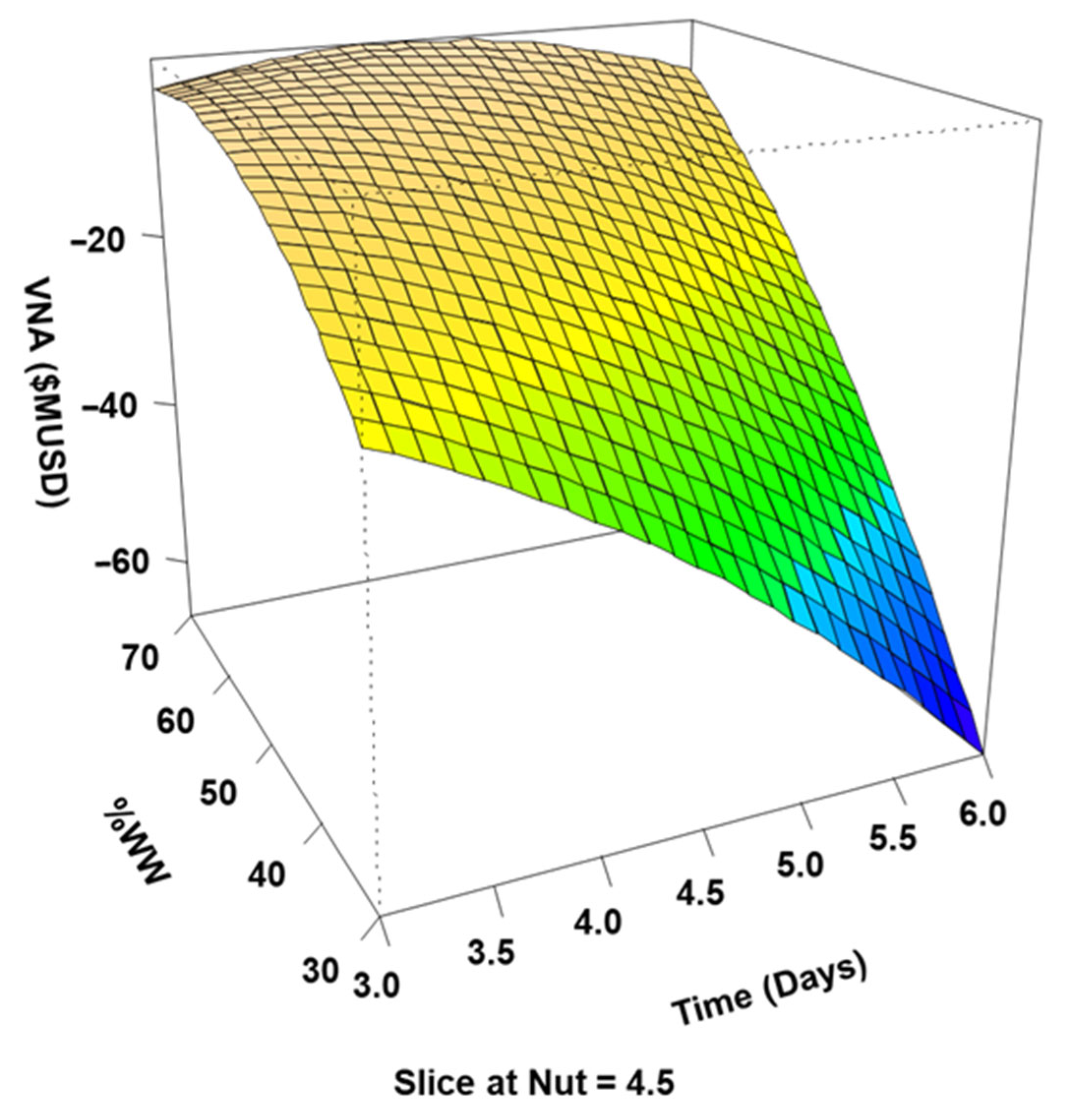 Experiment | NUT (%Vol/Vol.) | WW (%Vol/Vol.) | Ht (Days) | Initial SST | Final SST | Biomass (Ton/Year) | N (%wt./wt.) | P (%wt./wt.) | Selling Price (Bp) |