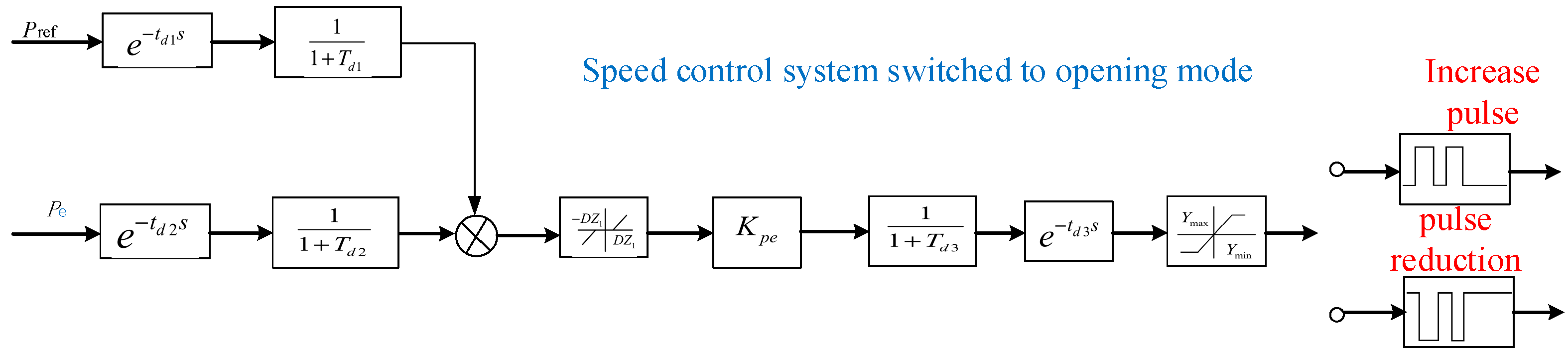 Specific model block diagram of LCU active control. In the figure, Pref represents the active power setpoint of the unit, Pe represents the active power feedback value of the unit, e is the natural logarithm, td1, td2, td3 are the time constants of the delay stages in the figure, Td1, Td2, Td3 are the measurement time constants of the pulse measurement stages in the figure, DZ1 is the deadband of the active power difference, Kpe is the proportional gain coefficient of the power closed-loop control, and Ymax and Ymin are the maximum and minimum values of the active power deviation limits.