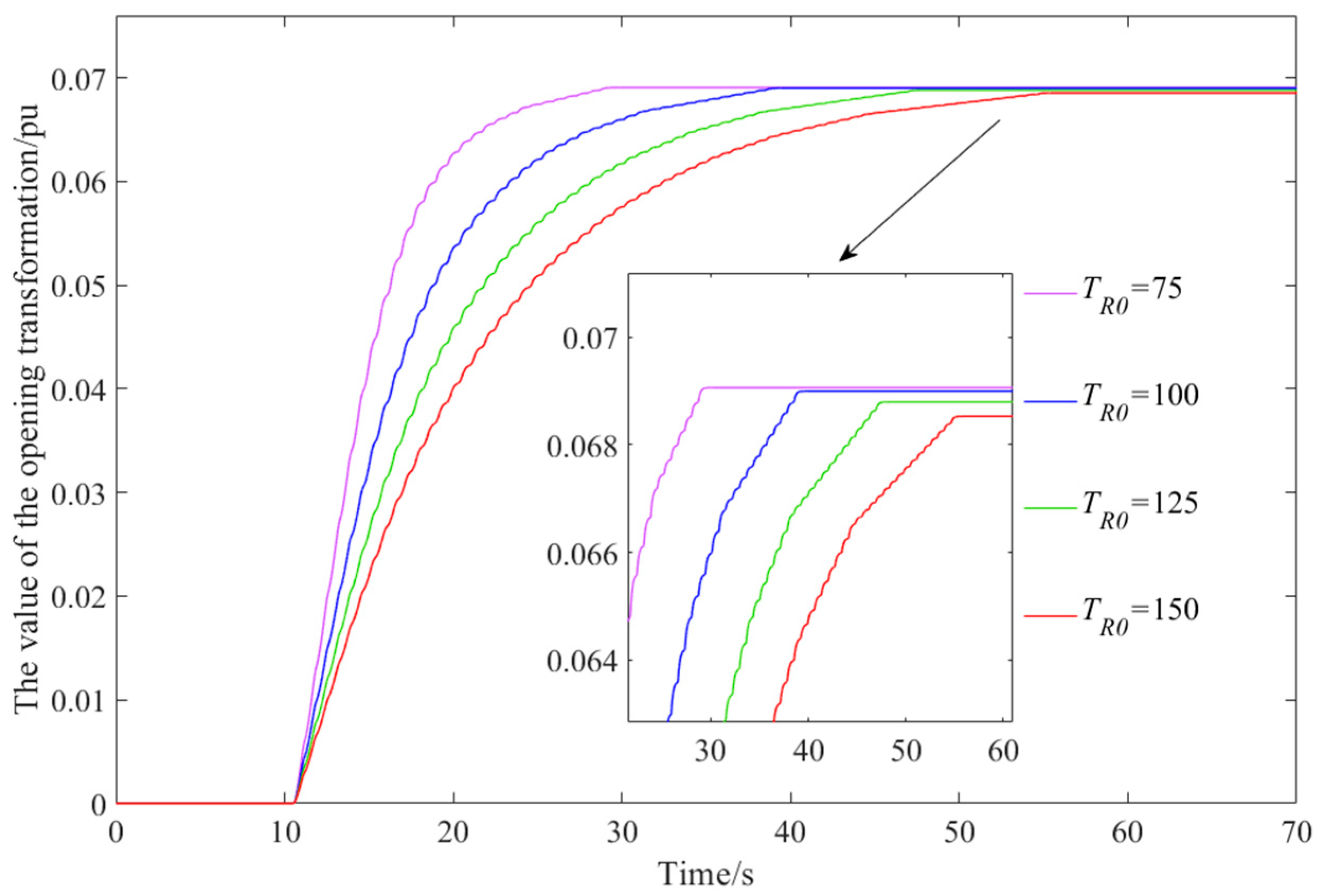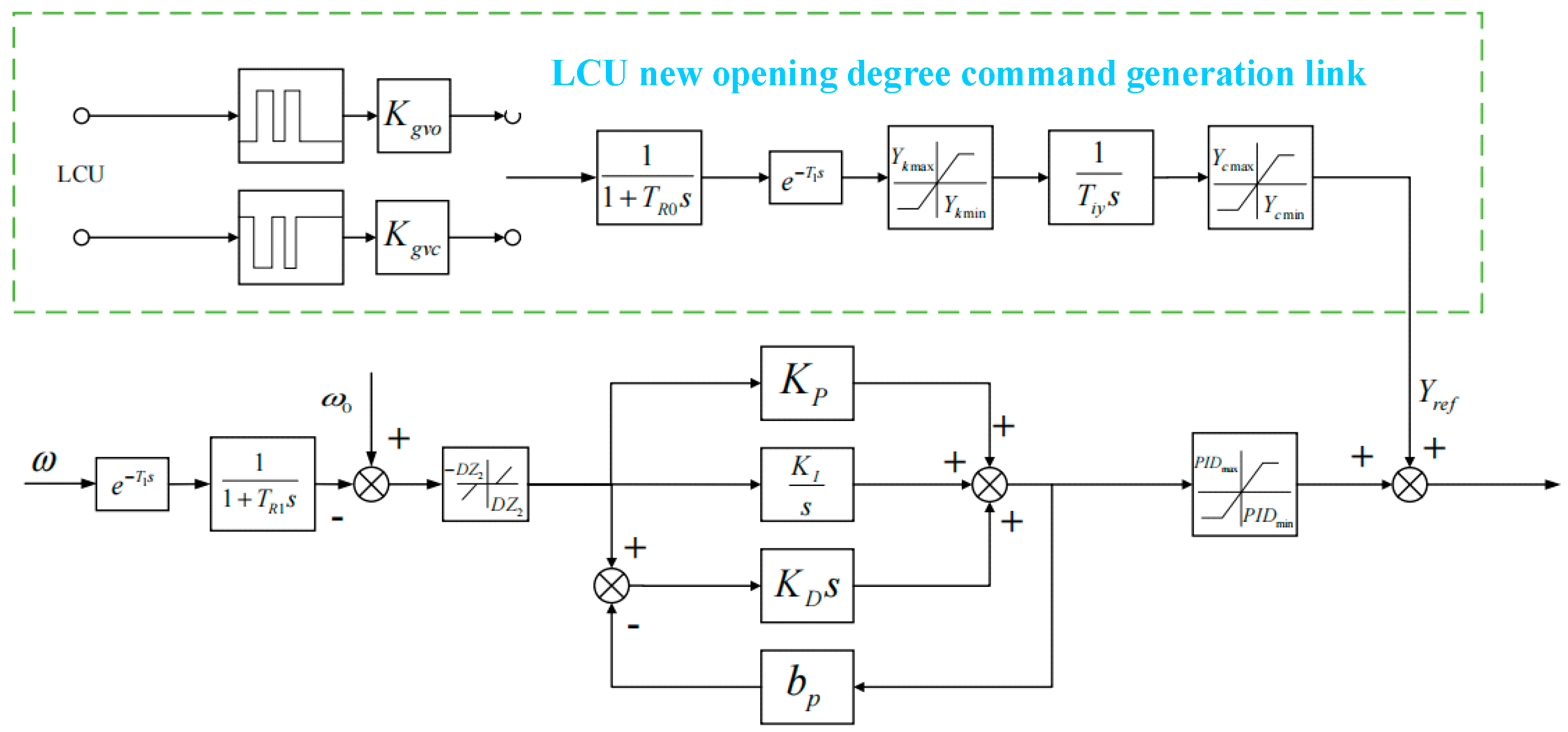 Newly added speed regulator model for the opening degree setpoint generation stage. In the figure, Kgvo and Kgvc are the proportional parameters for increasing and decreasing the guide vane opening at a given point, respectively; Ykmax and Ykmin are the maximum and minimum amplitude limits on the input side of the pulse/opening integral conversion link, respectively; Ykmax and Ykmin are the maximum and minimum amplitude limits on the output side of the pulse/opening integral conversion link, respectively; TR0 is the pulse measurement time constant; and T1 is the delay time constant of the measurement pulse.